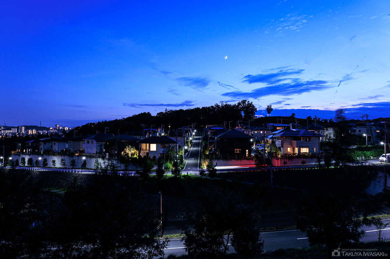 多摩ニュータウン東山は新興住宅地として整備されており、中央大学多摩キャンパスの付近に位置します。そよかぜの道と呼ばれる歩道からは、遠くは京王堀之内駅方面、手前には多摩ニュータウン東山の住宅の明かりが広がります。周囲は真っ暗ですが、視界が開けているため、足元さえ照らせれば安全面は問題なさそうです。