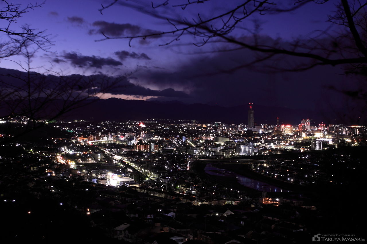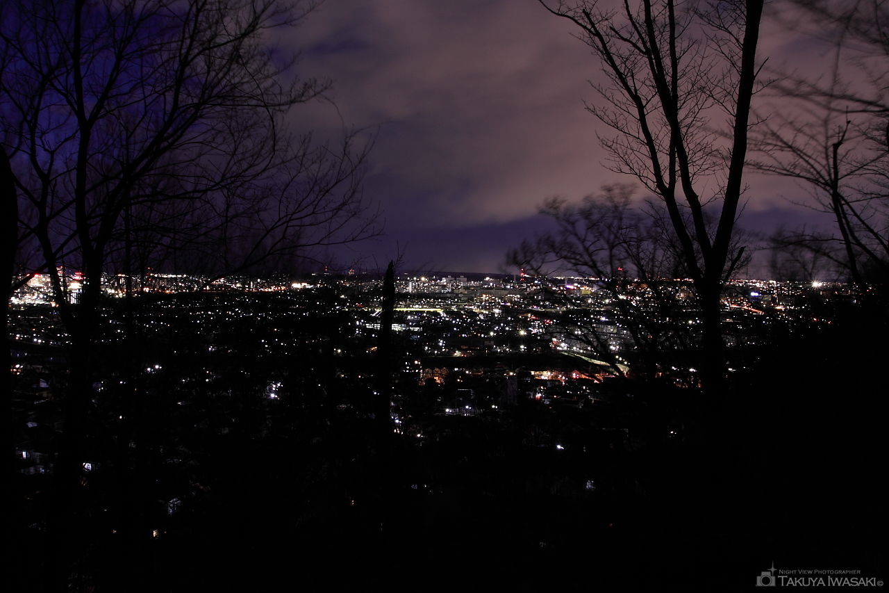 平山城址公園は八王子市と日野市にまたがる公園で、ハイキングコースとしても知られています。園内からも夜景が見えることで知られていますが、夜間は街灯が無く10分以上も歩く必要があることから、上級者向けの夜景スポットになっています。ただ、公園の付近から夜景が見えるポイントがあり、ここで紹介している場所は公園には入らず、公園沿いの尾根の途中にあります。一部視界が広がる場所があり、八王子駅方面・日野方面の夜景を眺められます。視界は木々が遮っていてやや狭いですが、街明かりとの距離が近いことから光量は十分にあります。