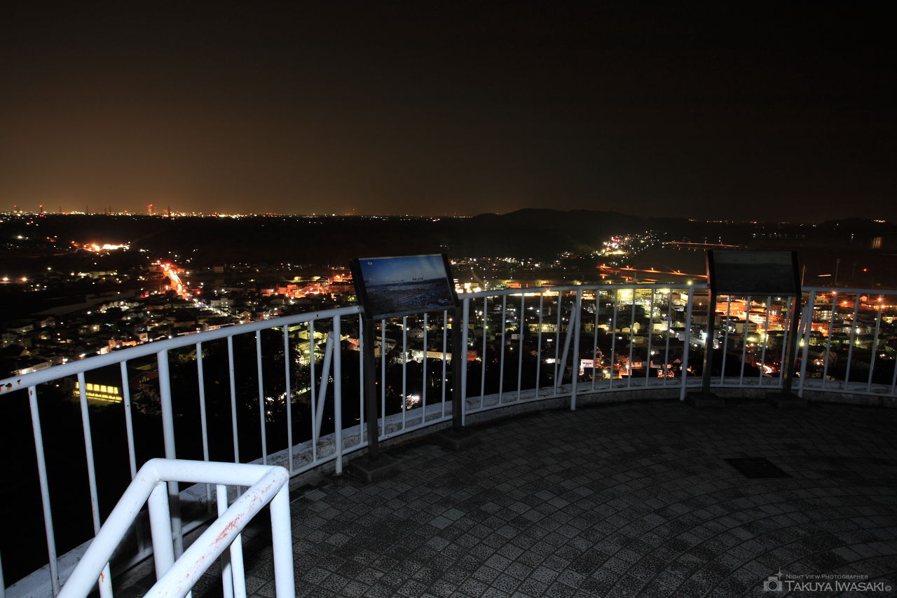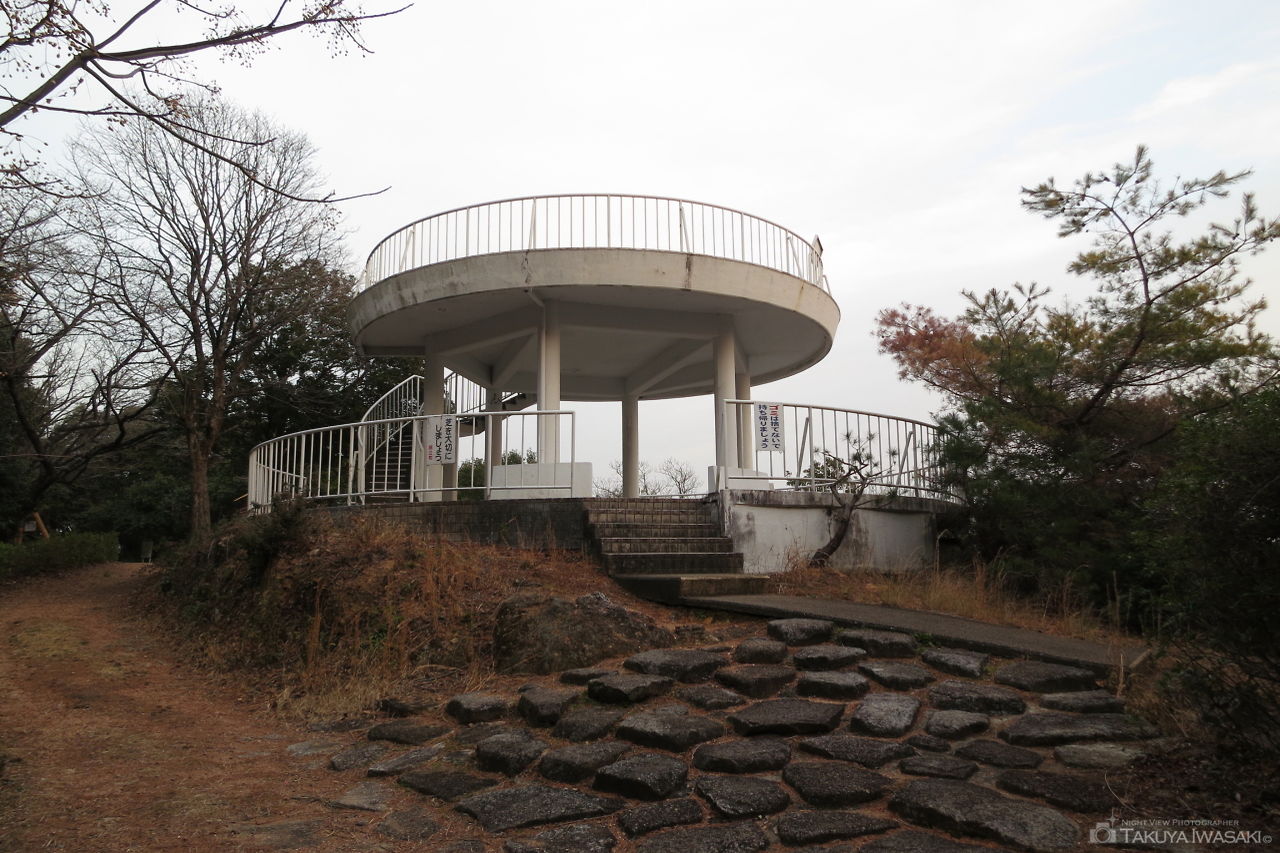 細江町の高台にある細江公園は駐車場から歩いて2分ぐらいの場所に展望台があり、開放感ある展望台からは細江町を中心とした浜松市内を間近で眺められます。光量が少ないわりに、夜景との距離が近いためか、思った以上に見応えのある夜景が期待できます。夜間は訪れる人が少ないため、運が良ければ展望台を貸し切り状態で夜景を楽しめることでしょう。展望台までは街灯が無いため、できるだけ懐中電灯の持参をお勧めします。