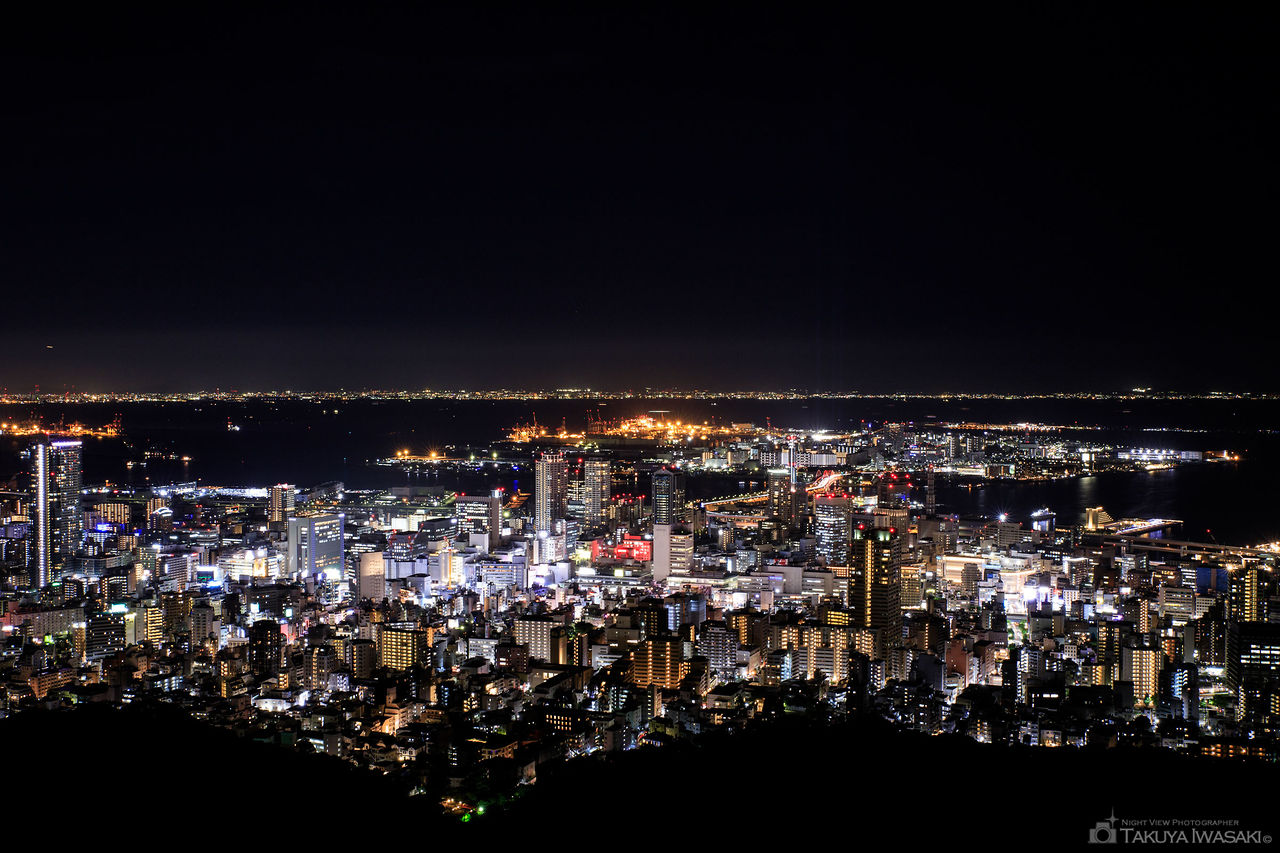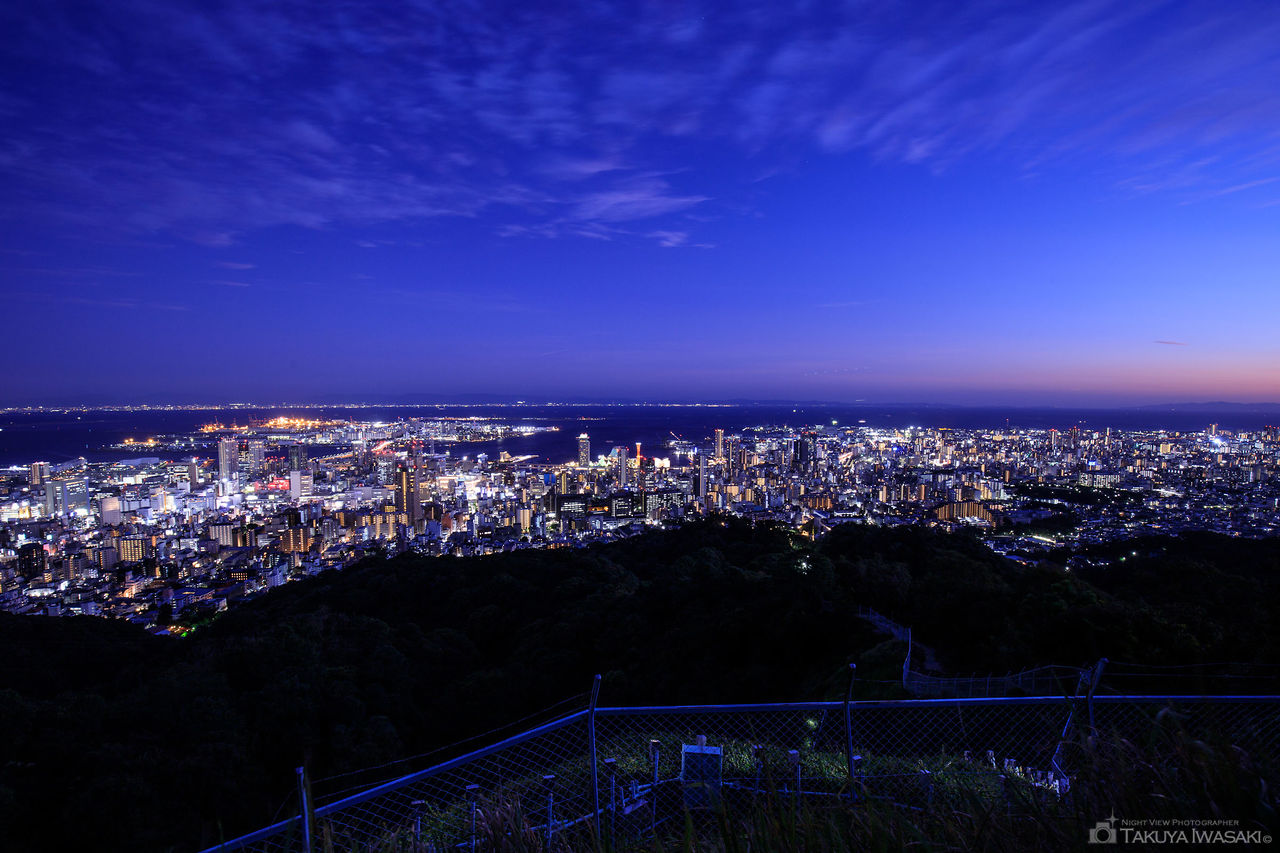 錨山は市章山の展望台から徒歩で数分下った場所にあり、風力発電が目印となります。市章山よりも展望環境が整っており、展望台からは神戸市内を中心としたパノラマ夜景が観賞できます。ビーナスブリッジと高度はそれほどの差がありませんが、樹木が視界を遮らないクリアな夜景が楽しめます。また、再度山DWに来たカップルや観光客のほどんどがビーナスブリッジに行く上、錨山は市章山からさらに徒歩で下るため、無人の可能性がより高いです。