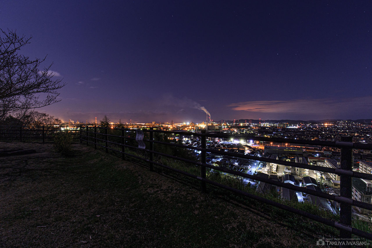 標高78mの亀島山一帯に整備された公園で、戦時中には総延長2kmのトンネルに地下工場が築かれた戦争史跡(現在は安全面の観点から閉鎖)としても知られています。桜の名所として市民に親しまれている公園ですが、市街地の中心にあるため高さが低い山とは思えないほど夜景が美しく、街明かりと水島コンビナートの工場が一度に見渡せます。