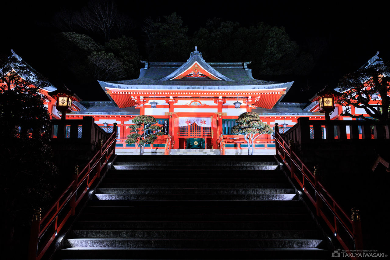 「恋人の聖地」として名高い足利織姫神社は、夜景ドライブの計画にぜひ組み込みたい一級のスポットです。24時まで実施される社殿のライトアップは非常に荘厳で、朱色の美しさが闇に映えます。