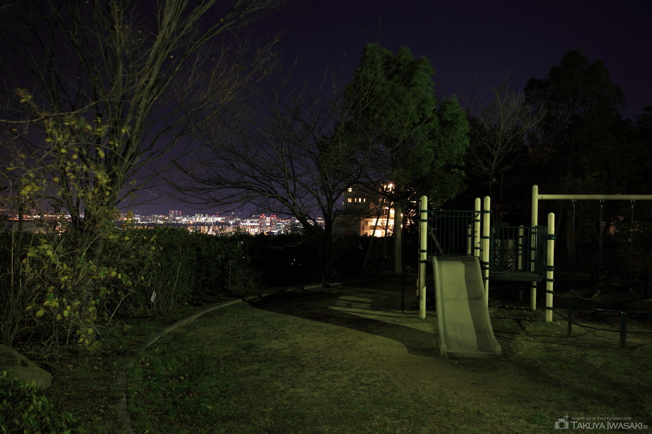 神戸大学から近くの場所にあり、整備されたこの公園からは三宮・ポートアイランド方面を中心とした神戸市内の夜景を一望できます。大月大橋や灘丸山公園と比べて大阪方面の視界が広いのが特徴です。ただ、視界を大きく遮っているのですべり台の上から夜景を観賞することをお勧めします。