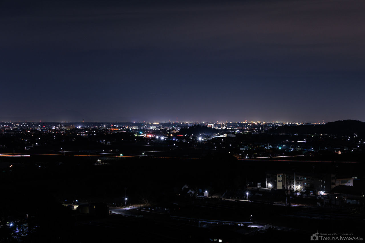 栃木市にある「栃木市聖地公園」は、山の斜面に整備された広大な市営霊園です。園内の最も標高が高い場所には駐車スペースが設けられており、そこからは栃木市内の夜景をパノラマ状に見渡すことができます。