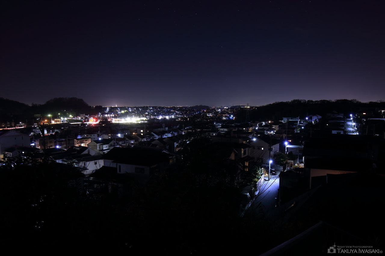城山台 第2児童公園の横にある墓地は高台になっており、墓地の入口付近からは城山台を中心とした夜景が広がり、奥行き感もあるため見応えある夜景が楽しめます。