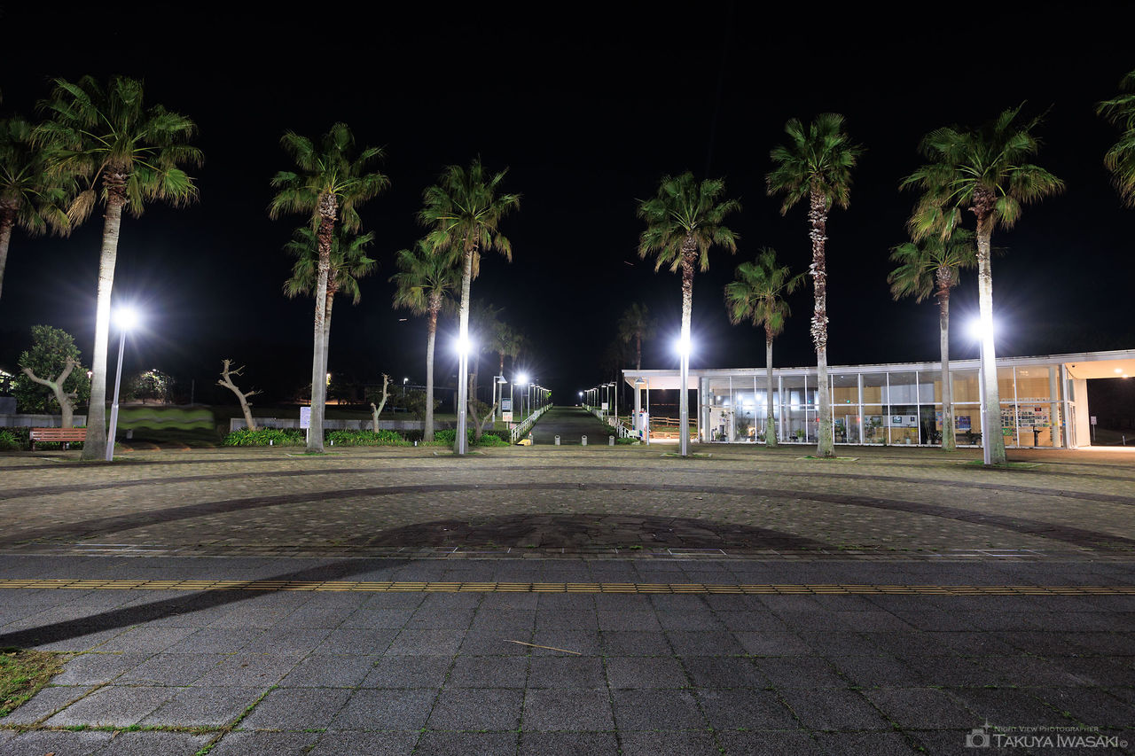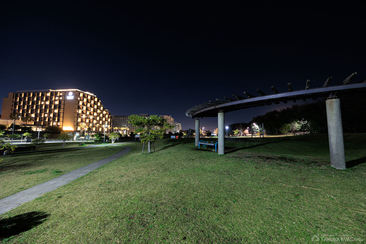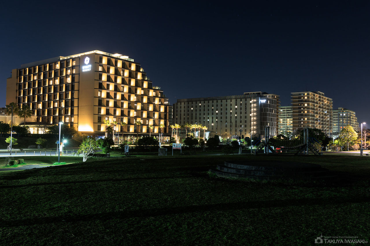 東京湾沿いにある広大な公園からは東京から千葉方面にかけての湾岸沿いの明かりを眺められます。