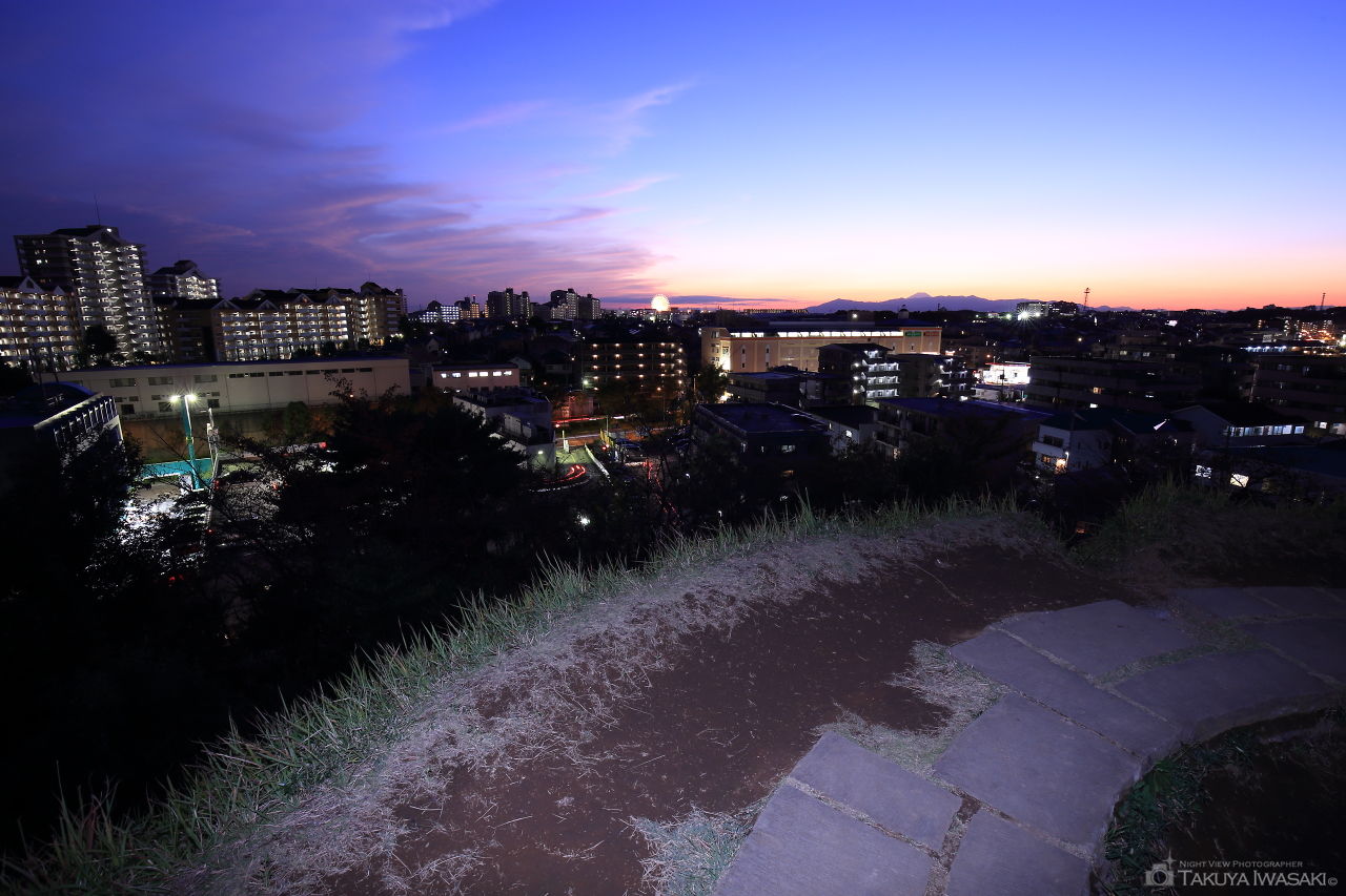 地下鉄北山田駅からほど近く、横浜国際プールの西側にある山田富士公園は名前の通り、富士山が見渡せる公園として地元でも知られており、桜の名所としても親しまれています。広大な公園の中に富士山の形をした丘があり、頂上からはセンター北方面を中心とした夜景が視界一面に広がります。夕暮れであれば富士山のシルエットも浮かび上がり、富士山愛好家が撮影に訪れることも。都筑区の中でも特に夜景が美しい場所と言えますが、公園内には駐車場が無く、夜間は真っ暗になるので、懐中電灯の持参が必要になります。住宅街の中の公園なので治安面は問題無いと思われますが、できれば早めの時間に訪れて夕景から楽しむことをおすすめします。