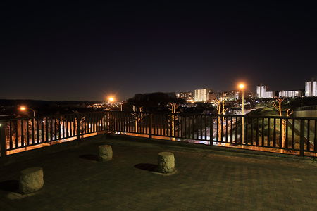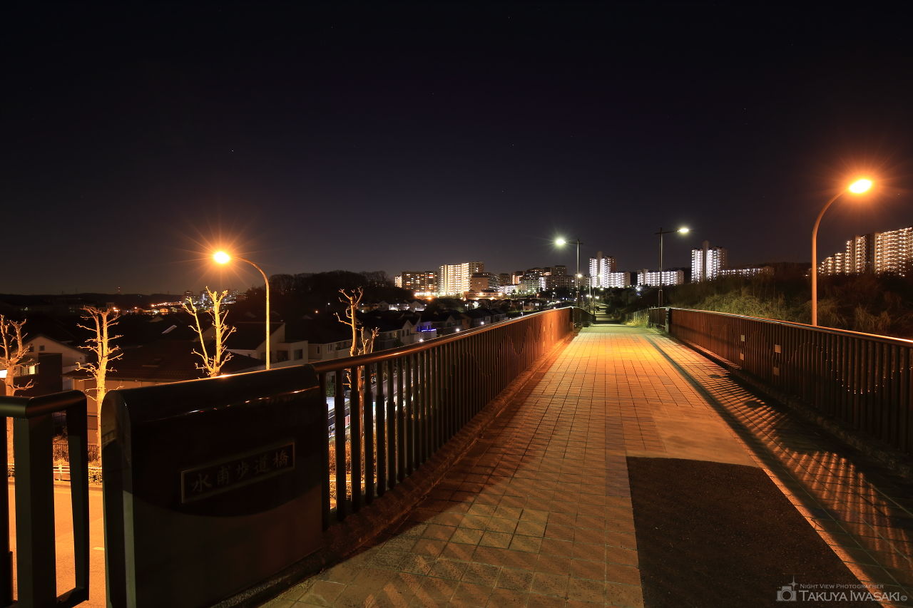 鑓水水甫公園は鑓水2丁目にある小さな公園で、ちょっとした遊具があります。公園の手前に歩道橋と小さな腰掛けのある展望スペースがあり、ここから鑓水・南大沢方面の夜景が見渡せます。高度がないため、夜景自体は小規模となりますが、辺り一面が街灯で照らされていて、雰囲気は良いので、夜景観賞自体に不安は感じられません。