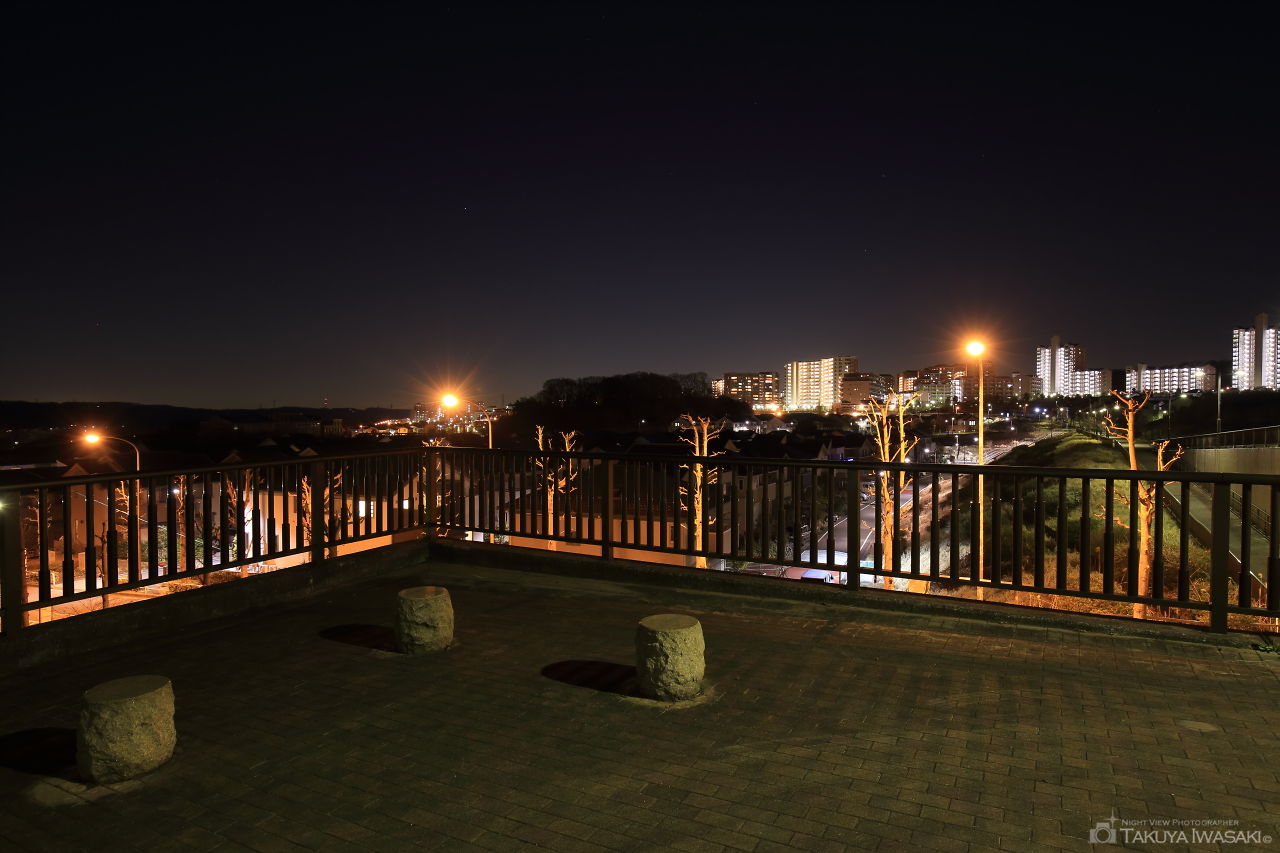 京王線多摩境駅からおよそ20分ほどの場所にある小さな公園。公園前にある展望スペースと歩道橋から鑓水のマンション街や南大沢方面の夜景が見渡せます。