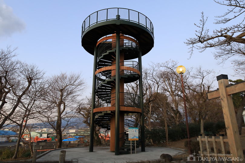 JR東海道線「吉原駅」の南側に完成した津波避難タワー。階段を登ると視界が広がり、メインは吉原駅方面の住宅街の明かりですが、田子の浦港も見渡...