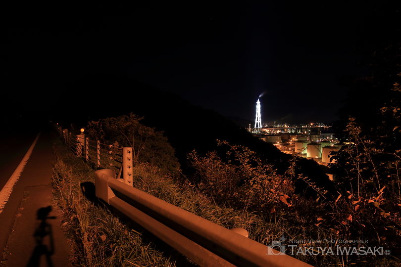【2019年7月末にJXTGエネルギー室蘭製造所の保安灯が消灯され、工場の明かりが減っています】室蘭市内で工場夜景作品を撮るという観点だけで考えれば、ここのビューポイントほど景観に優れた場所は無いかもしれません。正面にはJXTGエネルギーのオイルタンク群が広がり、右手にはプラント、そして奥には白鳥大橋が見渡せ、全体の景色を撮ったり、プラントの一部を撮ったりと、様々な構図の撮影が楽しめます。ただし、展望スペースなどが一切無く、国道は大型車両の通行も少なく無いので、安全面に非常に気を使います。そのため、初心者の訪問はおすすめできません。訪問される方はくれぐれも自己責任で。