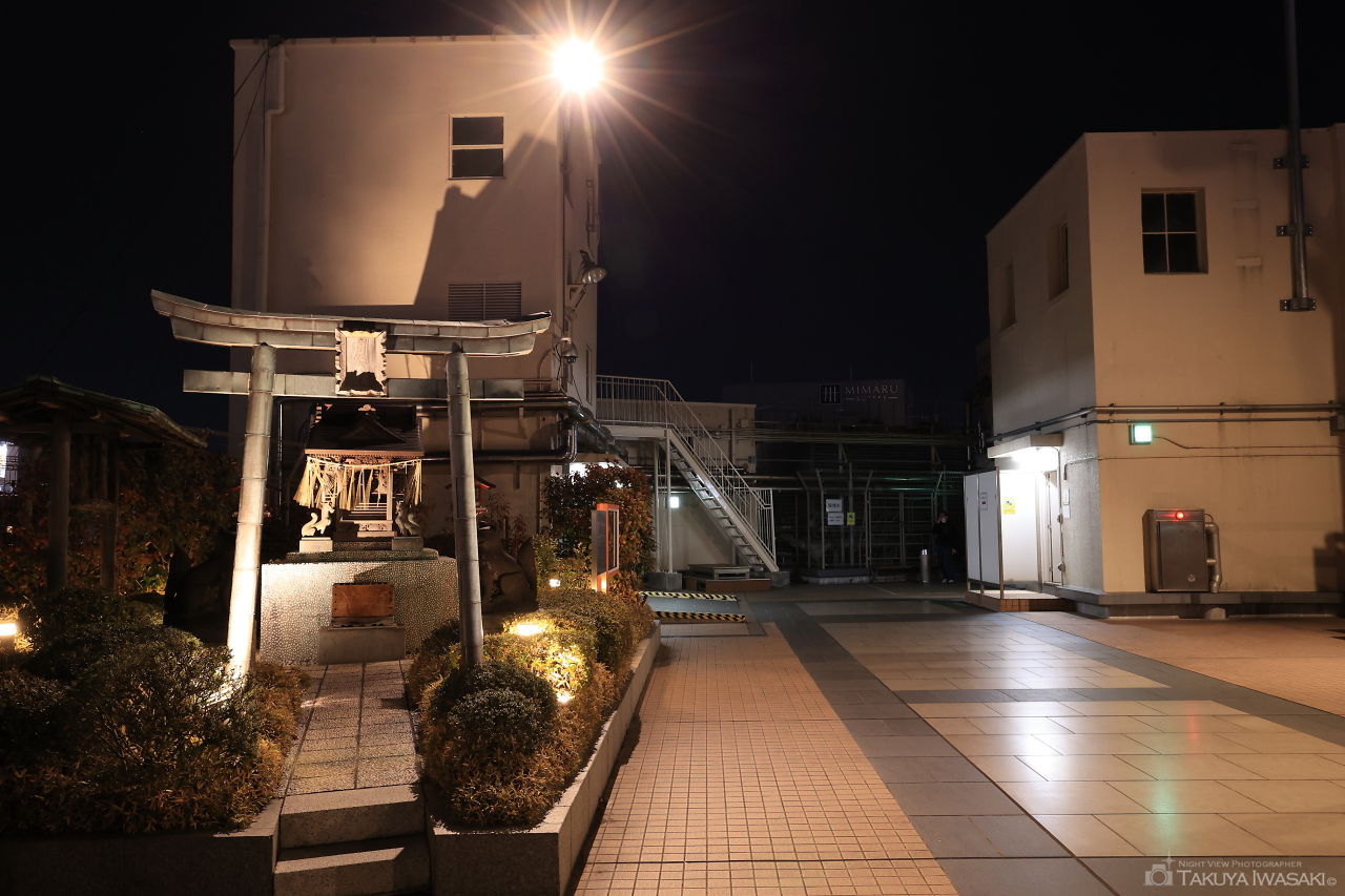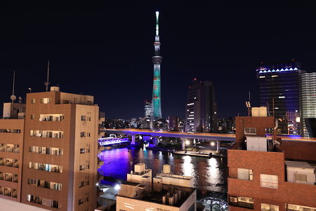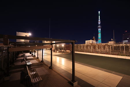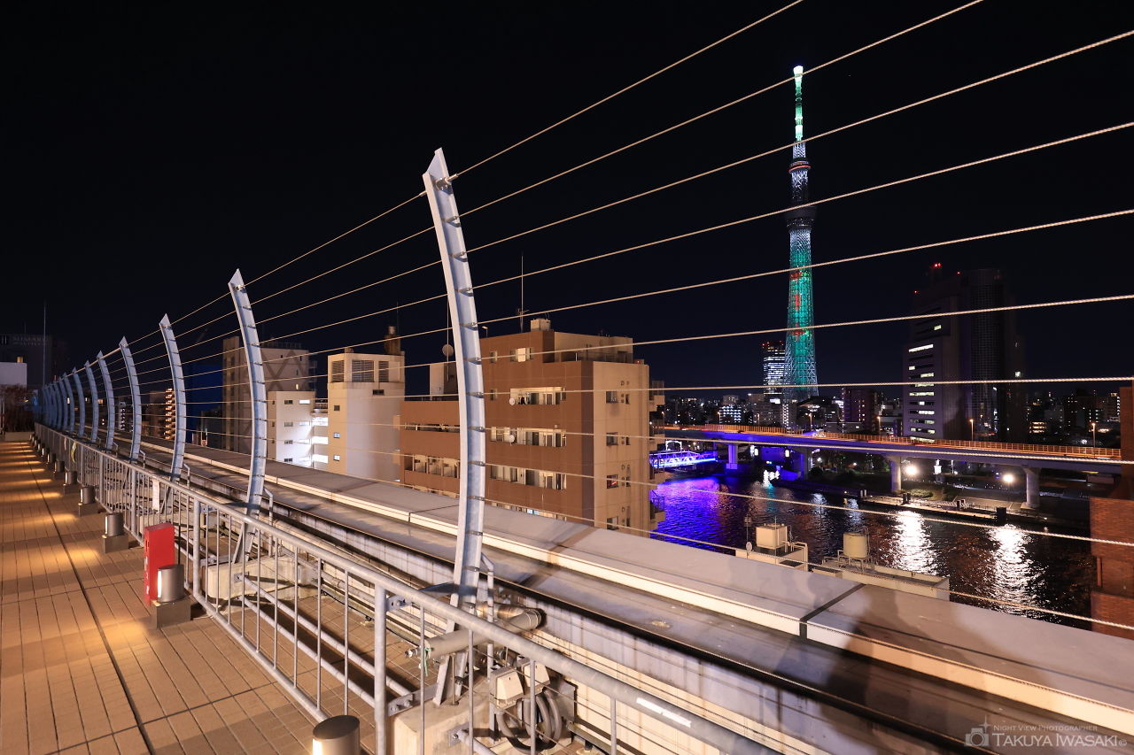 東京スカイツリー(R)のライティングを観賞できる穴場的スポット。吾妻橋に比べて通行量も少なく、比較的落ち着いて夜景を楽しめます。