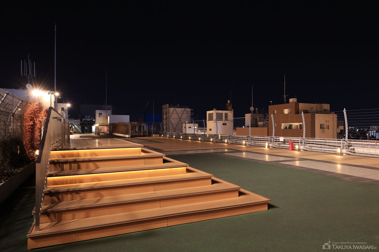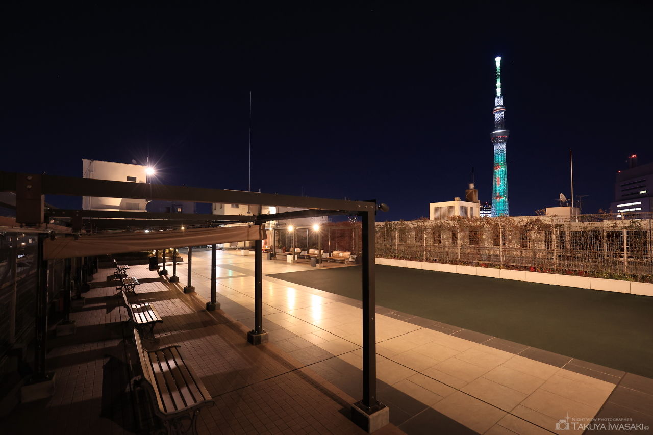 浅草EKIMISEの8階屋上に浅草ハレテラスと呼ばれる展望デッキがあり、ライティングされた東京スカイツリーを観賞できます。デッキは広々としていて、ゆったりと夜景を楽しめます。