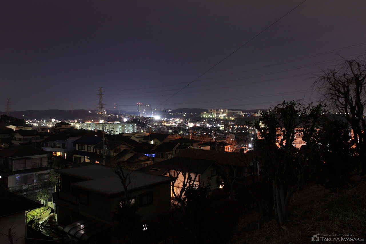 多摩市内のニュータウンにある愛宕団地の手前の道路からは、視界が開けており、和田・大塚方面の住宅街の夜景が見渡せます。それほど視界は広くありませんが、住宅街らしい落ち着きある夜景が楽しめます。なお、付近は住宅街のため、深夜の訪問を控えるなどマナーへの配慮が必要です。