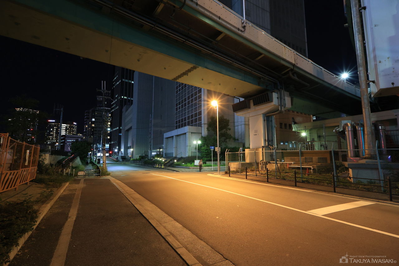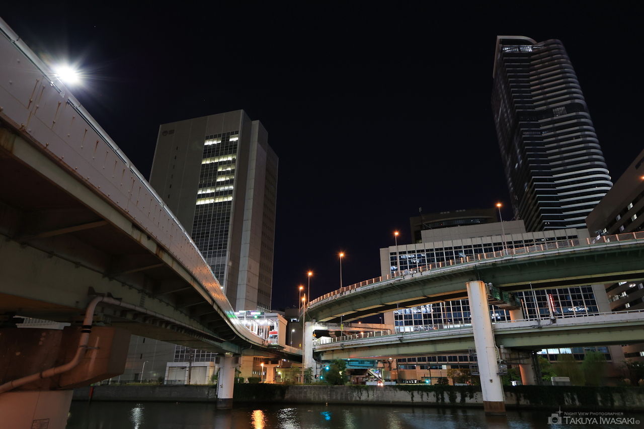 中之島の高層ビル群や阪神高速道路が見渡せる道路で、夜間は通行する人も少なく、静かに夜景を楽しめます。