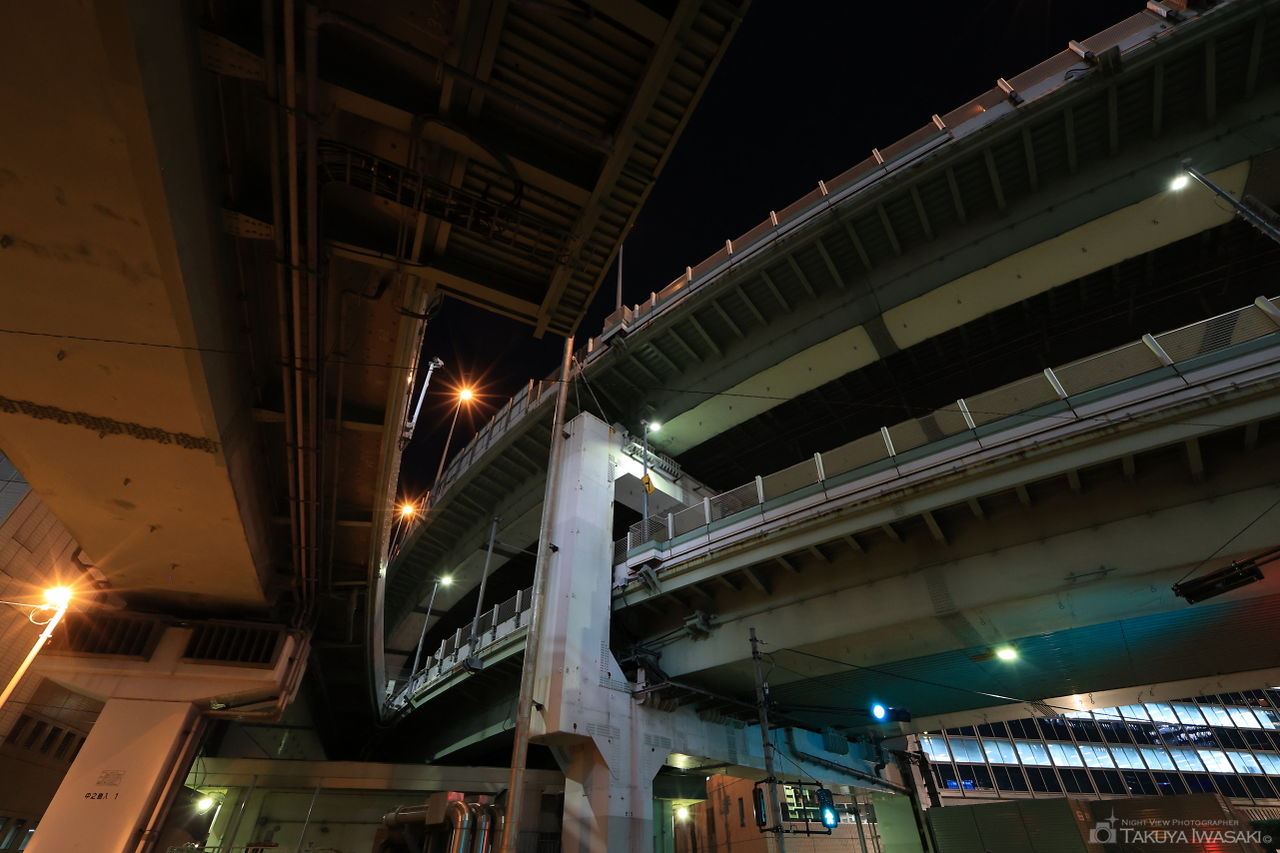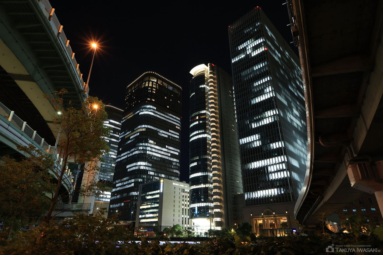 阪神高速中之島料金所の真下付近にある通りからは、中之島の高層ビル群を見渡せます。ジャンクションほどの規模感はありませんが、阪神高速道路も見上げて観賞できるため、撮影スポットとしても良さそうです。