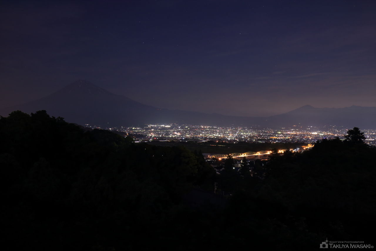 JR富士川駅から徒歩圏にある富士川第一公園は「うら山公園」という通称でも親しまれており、駐車スペースから4分ほど園内を歩くと展望台があります。展望台からは昼間であれば富士山が見渡せ、夜になると富士川を挟んで、富士市を中心とした夜景が見渡せます。トワイライトタイムや空気の澄んでいる日であれば富士山のシルエットも一緒に楽しめます。