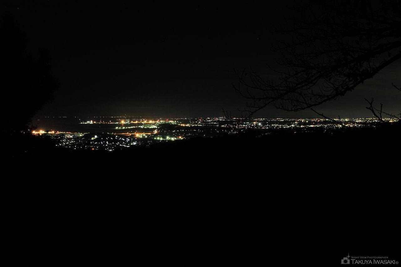 標高241.9mの風神山は日立市と常陸太田市の境にあり、登山道も整備されているようです。展望広場からは日立港を中心に日立市内の夜景を眺められます。工業地帯から住宅街まで幅広い夜景が見渡せますが、光量はやや控えめとなっています。駐車場から展望広場へは歩いて2分程度ですが、周囲が暗いため懐中電灯は必須となります。