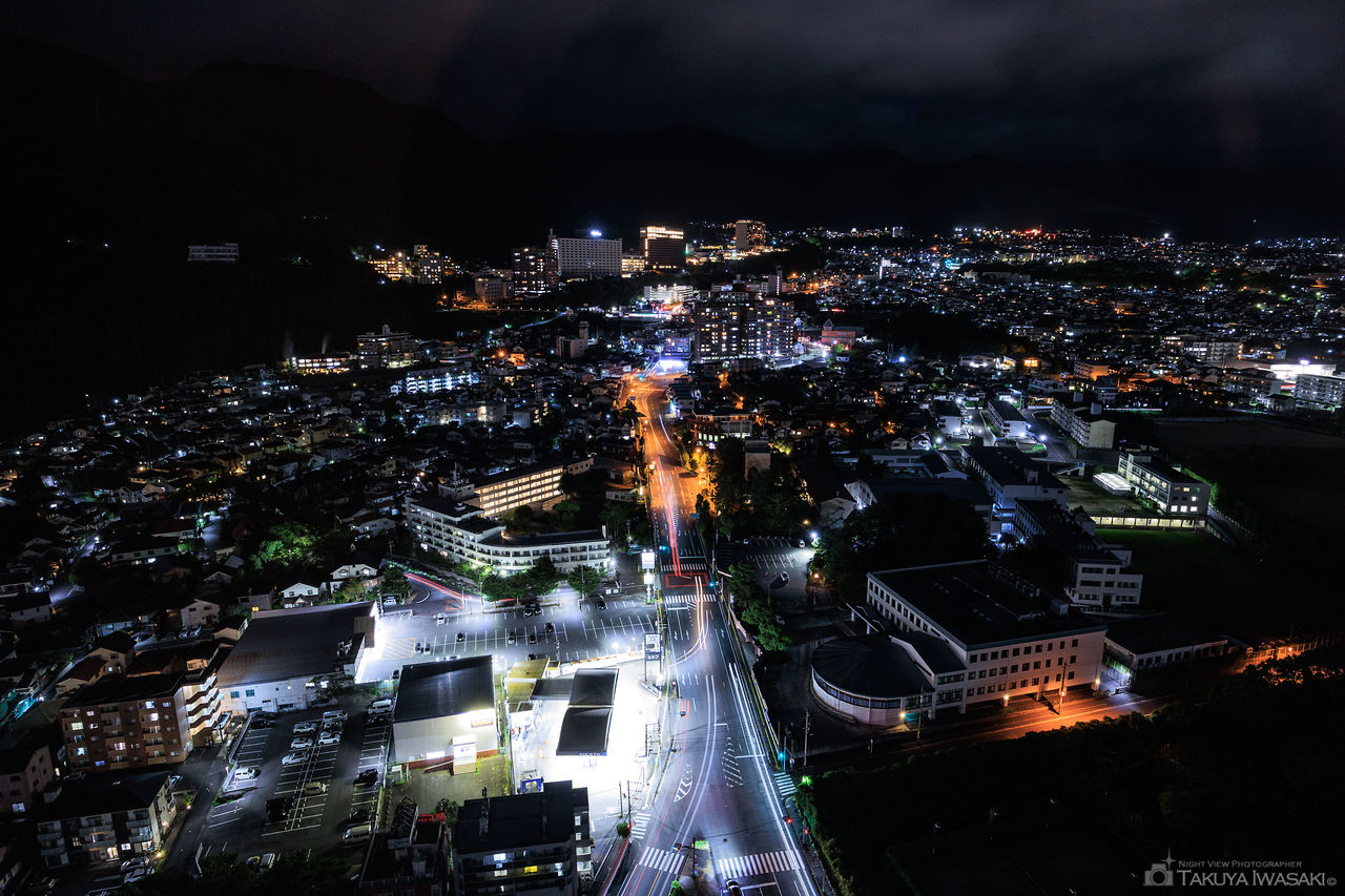石垣原合戦で西軍に仕えた吉弘嘉兵衛統幸の陣所跡の公園がビューポイント。公園と駐車場手前の道路からは別府市内の夜景が見渡せます。