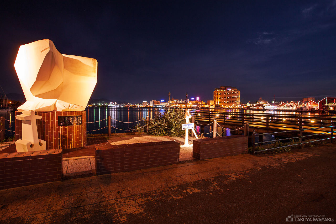 元町公園から基坂を下り、右手に曲がった場所に東浜桟橋があり、かつては沖に停泊した連絡船から上陸する際に活用されていたそうです。今では函館ベイエリアの夜景を楽しめる名所として知られており、地元の方の散歩や夜景観賞のために訪れるカップルの姿も目立ちます。桟橋はフットライトで照らされており、金森赤レンガ倉庫や西波止場のライトアップも間近で眺められるのが特徴です。桟橋には終日訪問できますが、函館ベイエリアのライトアップは原則22時で消灯するので早めの時間帯の訪問をお勧めします。ちなみに桟橋の入口付近には熊と錨をモチーフにした白い地碑が建てられていますが、「北海道第一歩の地碑」と呼ばれており、函館に内地の人々が上陸した第一歩を意味するそうです。