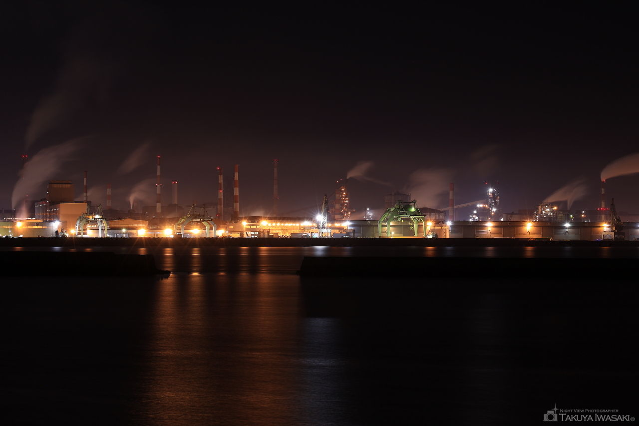 高砂火力発電所の先にある釣りスポット。高砂火力発電所はもちろん、対岸に製鉄所の工場夜景が見渡せます。