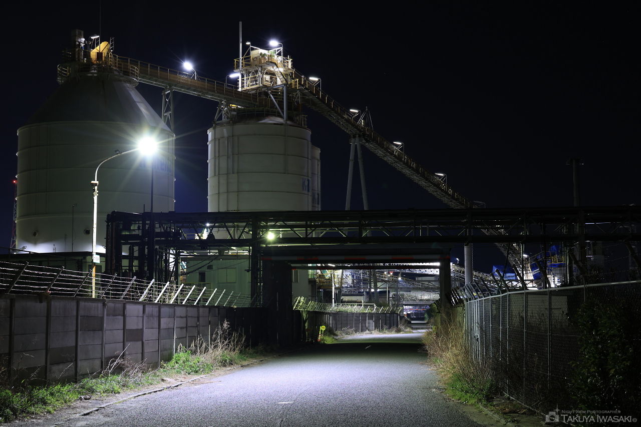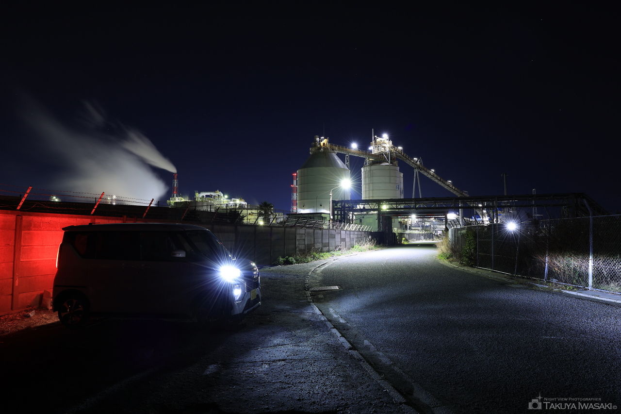 高砂市内で最も間近に工場夜景が見渡せる道路。高砂火力発電所のプラントや煙突を至近距離で見渡せます。