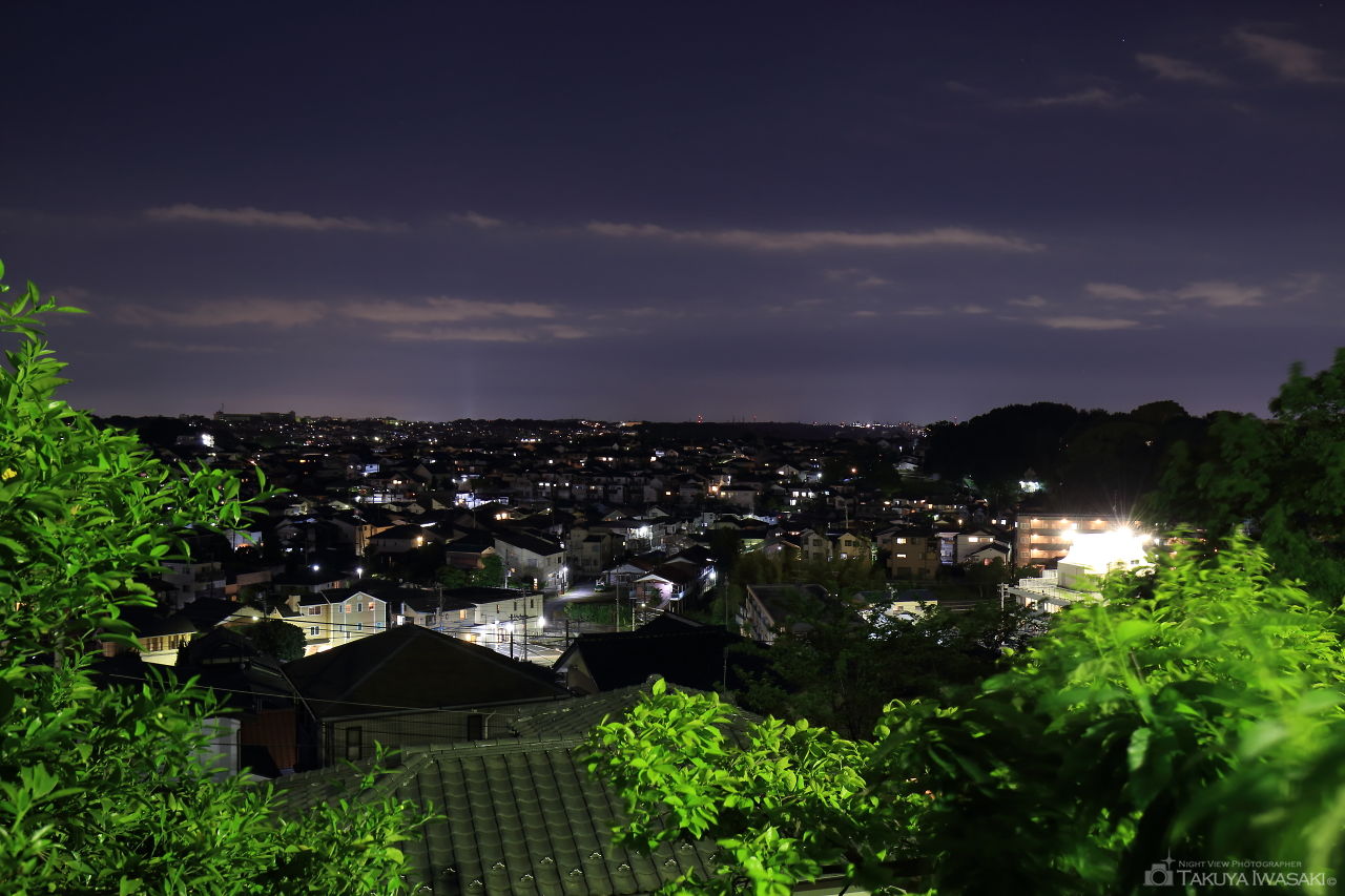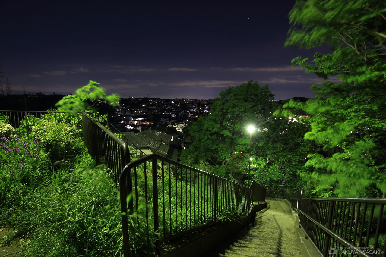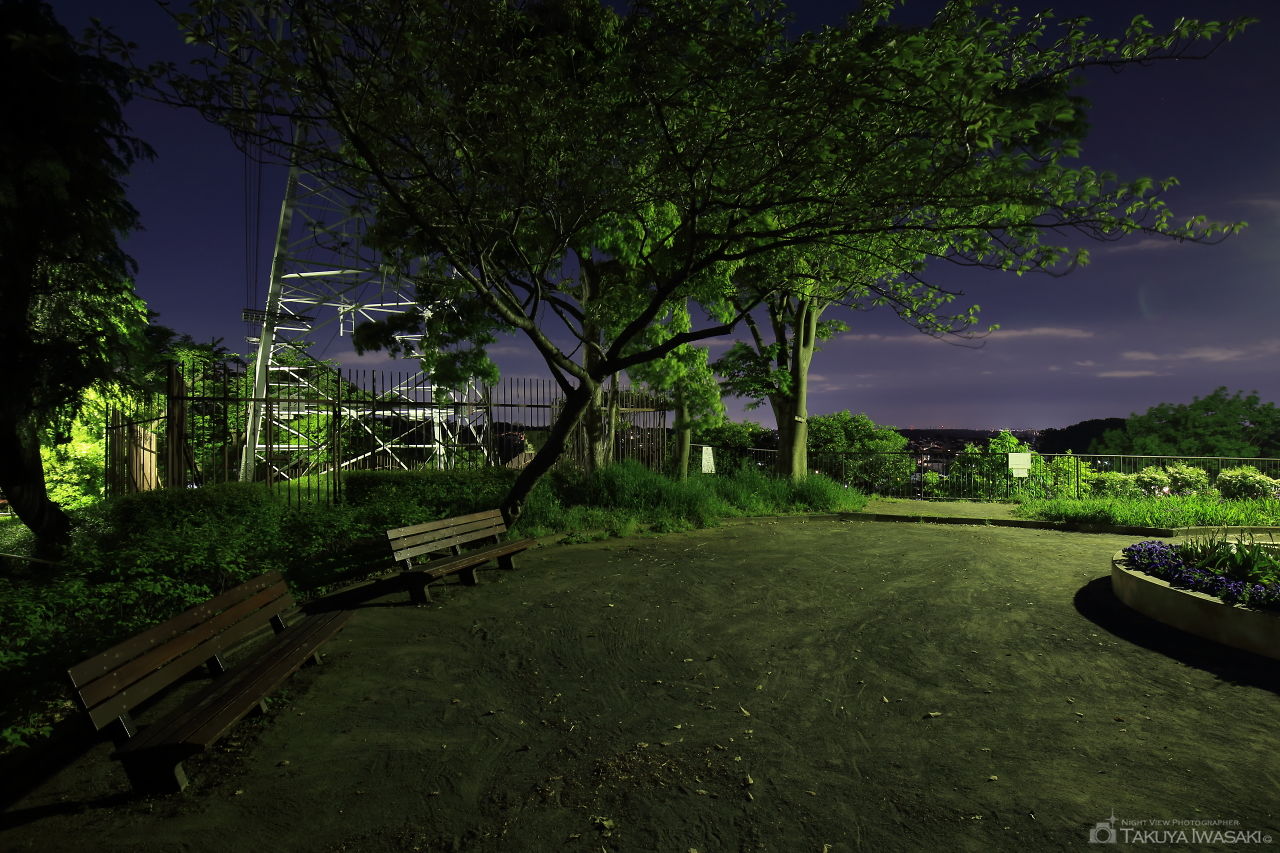 JR横浜線・鴨居駅から徒歩圏にある、住宅街の一角にある公園。公園は斜面上に形成されており、見晴らしに優れています。公園の中に眺望に優れた場所があり、ちょうど階段を登り切った位置からは鴨居の住宅街の夜景が広がり、日没後であれば遠くに富士山のシルエットも浮かび上がります。ただ、公園内は樹木の成長具合によって見晴らしが変わってくるので、夜景観賞目的に訪れるなら秋から冬にかけてがおすすめです。
