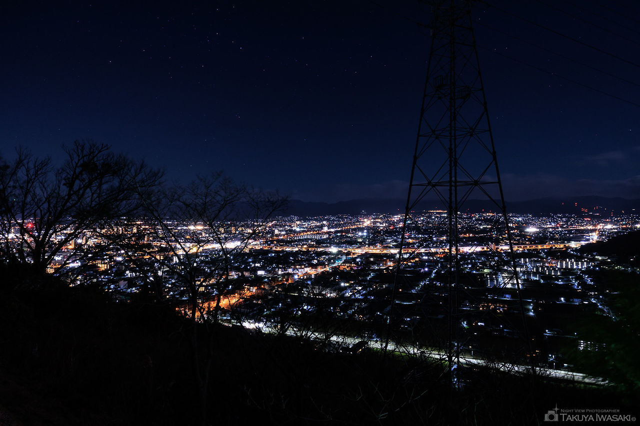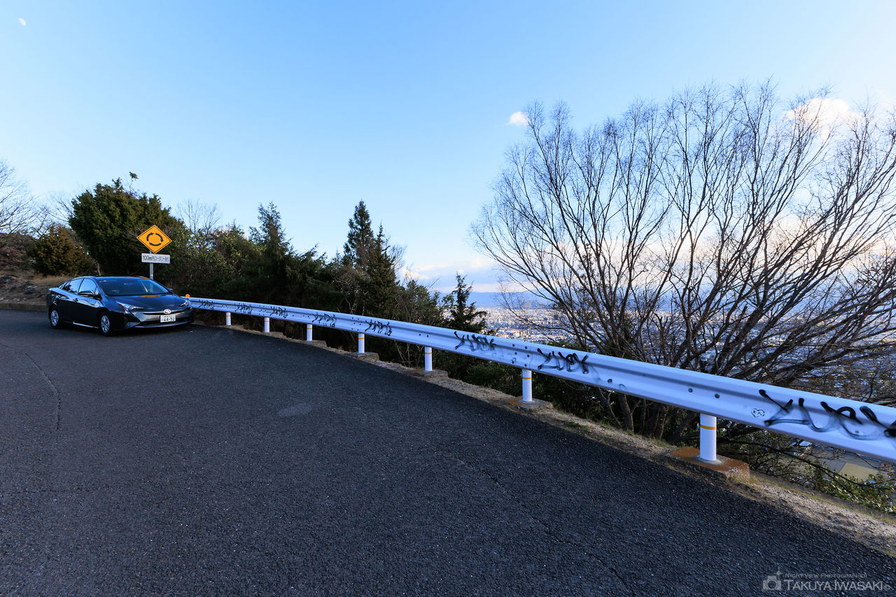 夜景・絶景スポットとしても知られる峰山公園の付近にあり、姫塚古墳に隣接する道路沿いがビューポイントとなります。車を停めての夜景観賞が可能で、夜景目的に訪れる若者の姿も見かけます。眺望できる範囲は狭めで、峰山公園には遠く及びませんが、車から降りて歩くことなく夜景を楽しめる点はポイントです。ドライブついでに軽く夜景を楽しむようなシチュエーションにオススメです。