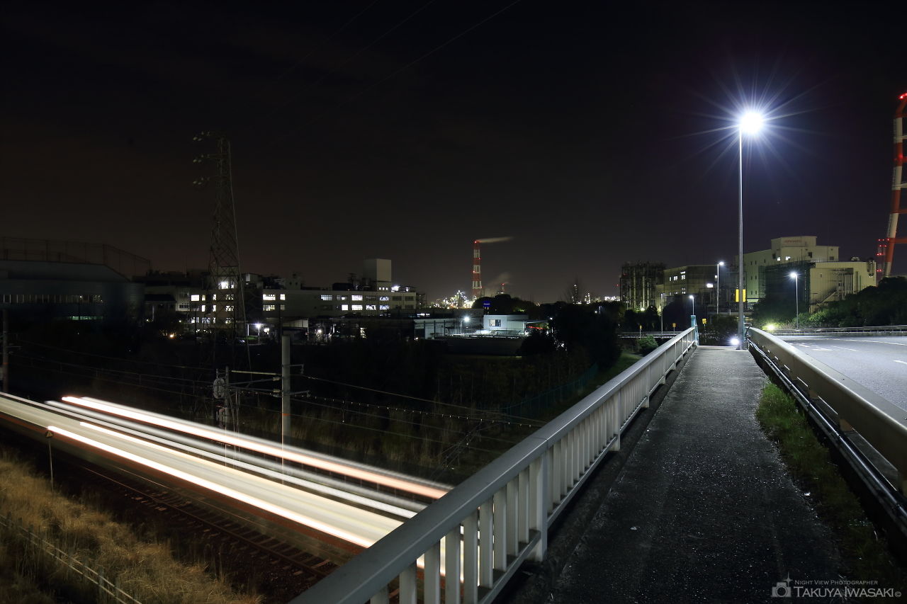日永跨線橋は南四日市駅からも徒歩圏にあり、関西本線をまたぐ車道となっています。車道の北側には歩道橋があり、JRの線路の真上あたりがベストビューポイントとなります。ここからは三菱ガス化学を中心とした工場夜景が至近距離で眺められ、奥には光輝くプラントが見渡せます。