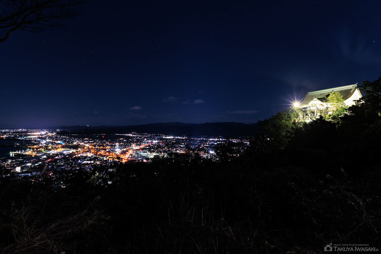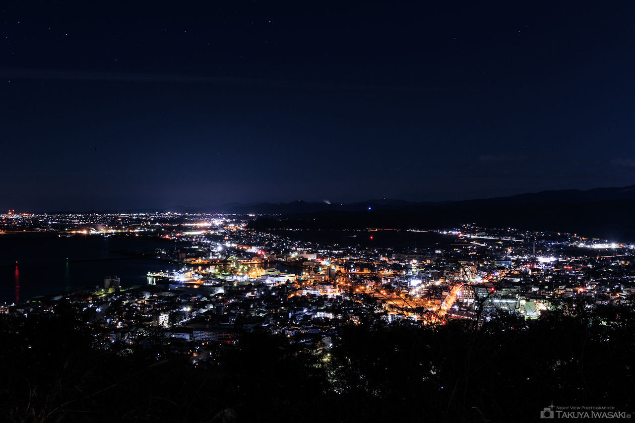 日峯神社の駐車場は、眺望に優れており、小松港を中心とした夜景を車内から楽しめるため、人気の夜景スポットと言えます。