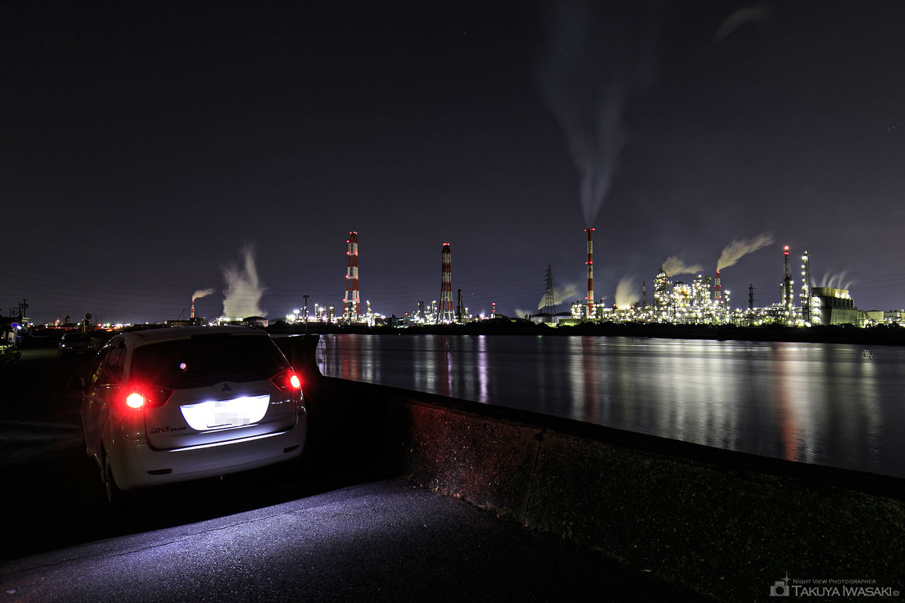 工場夜景観光で全国的にも知られている四日市市。市内に工場夜景を観賞できるスポットが点在していますが、鈴鹿川の南側にある磯津堤防突堤は四日市観光協会のホームページでも紹介されている夜景撮影ポイントとなっており、鈴鹿川の対岸にある中部電力の変電所や昭和四日市石油の工場夜景を見渡せます。道路に車を停車させれば、車内からも工場夜景を観賞できるので、ちょっと回り道をして工場夜景を楽しんでみるのもお勧めです。