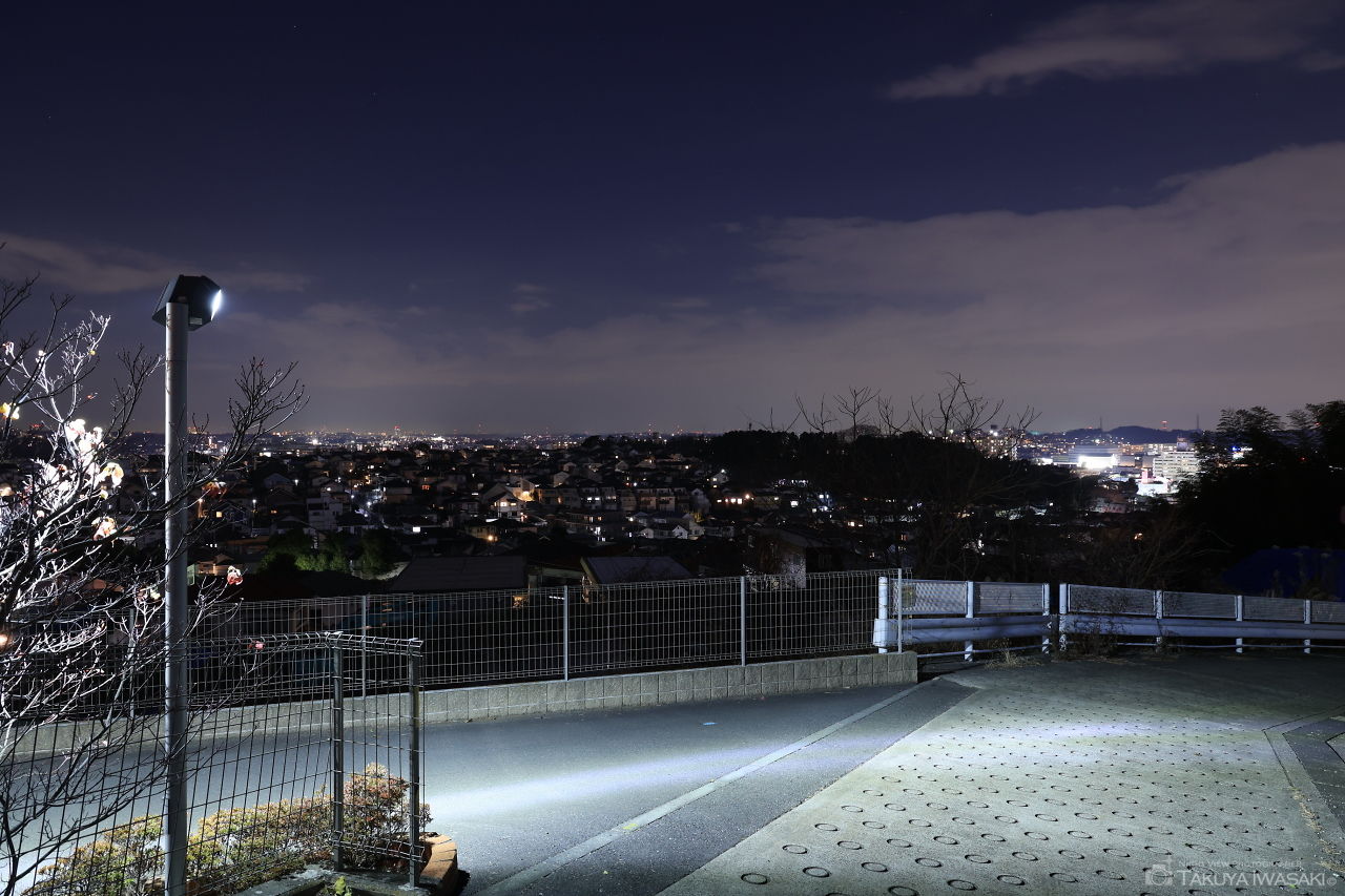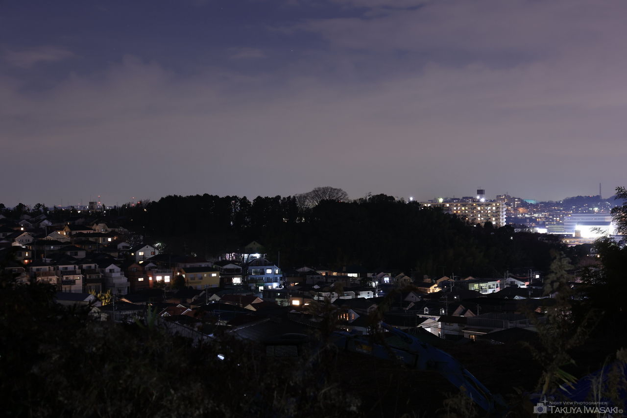 都筑区の住宅街の中にある月出松公園は縄文時代の遺跡があったことで知られています。ベンチに座って十日市場や川和台方面の夜景を観賞できます。