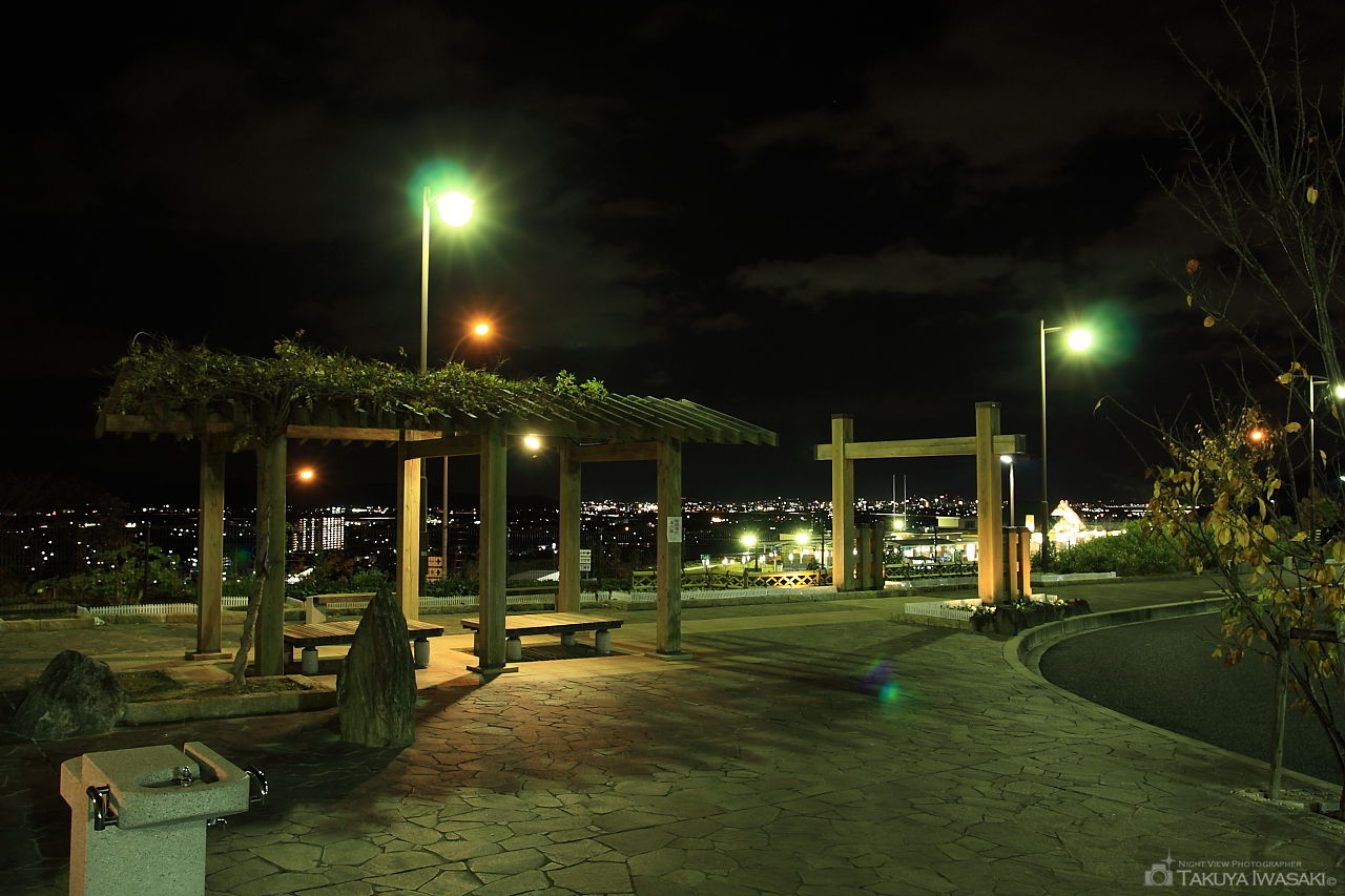 展望緑地に向かう途中に見える小さな広場がビューポイント。高度はそれほどありませんが、関西国際空港を中心とした夜景が楽しめます。