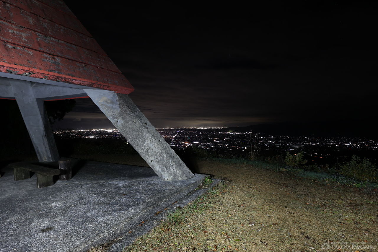 国見ヒュッテより、南方向に50~60mの場所に展望台のある公園があり、砺波市・南砺市を中心に砺波平野の夜景を見渡せます。