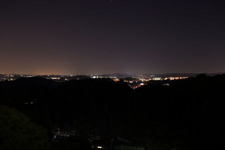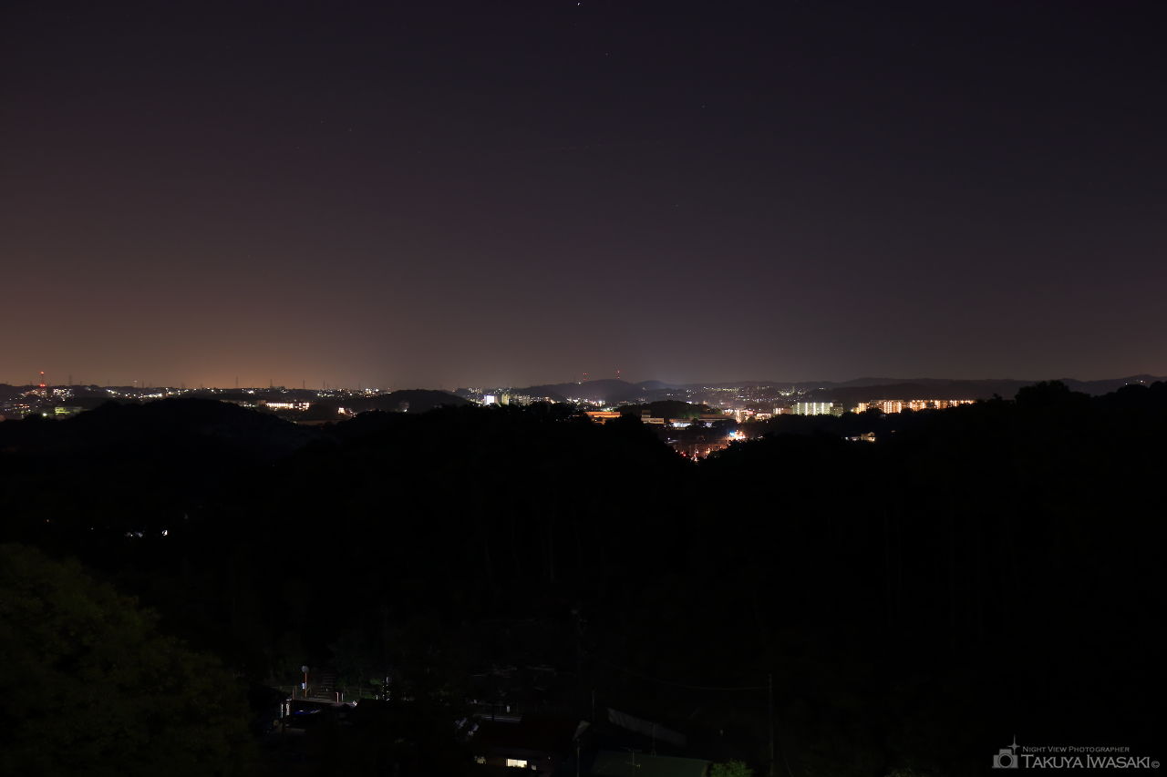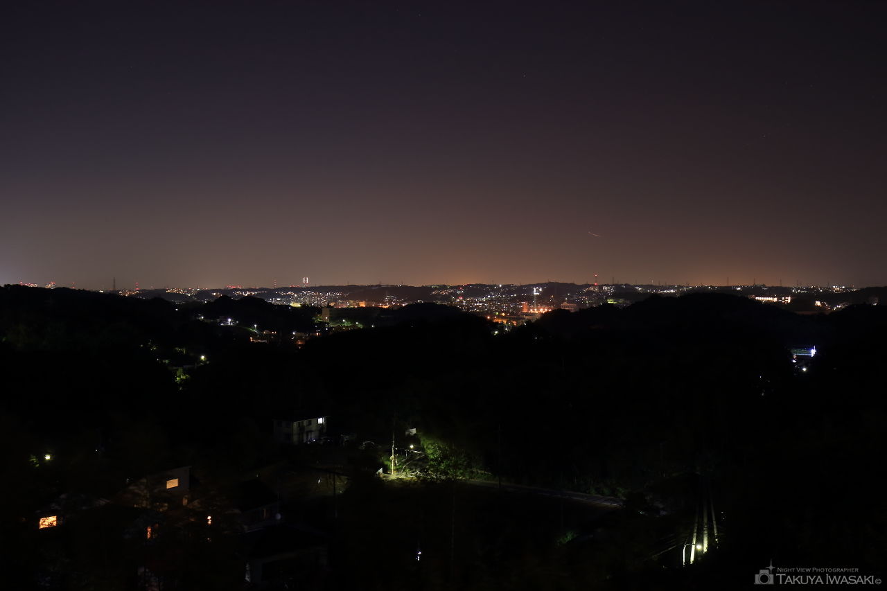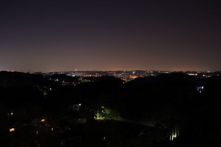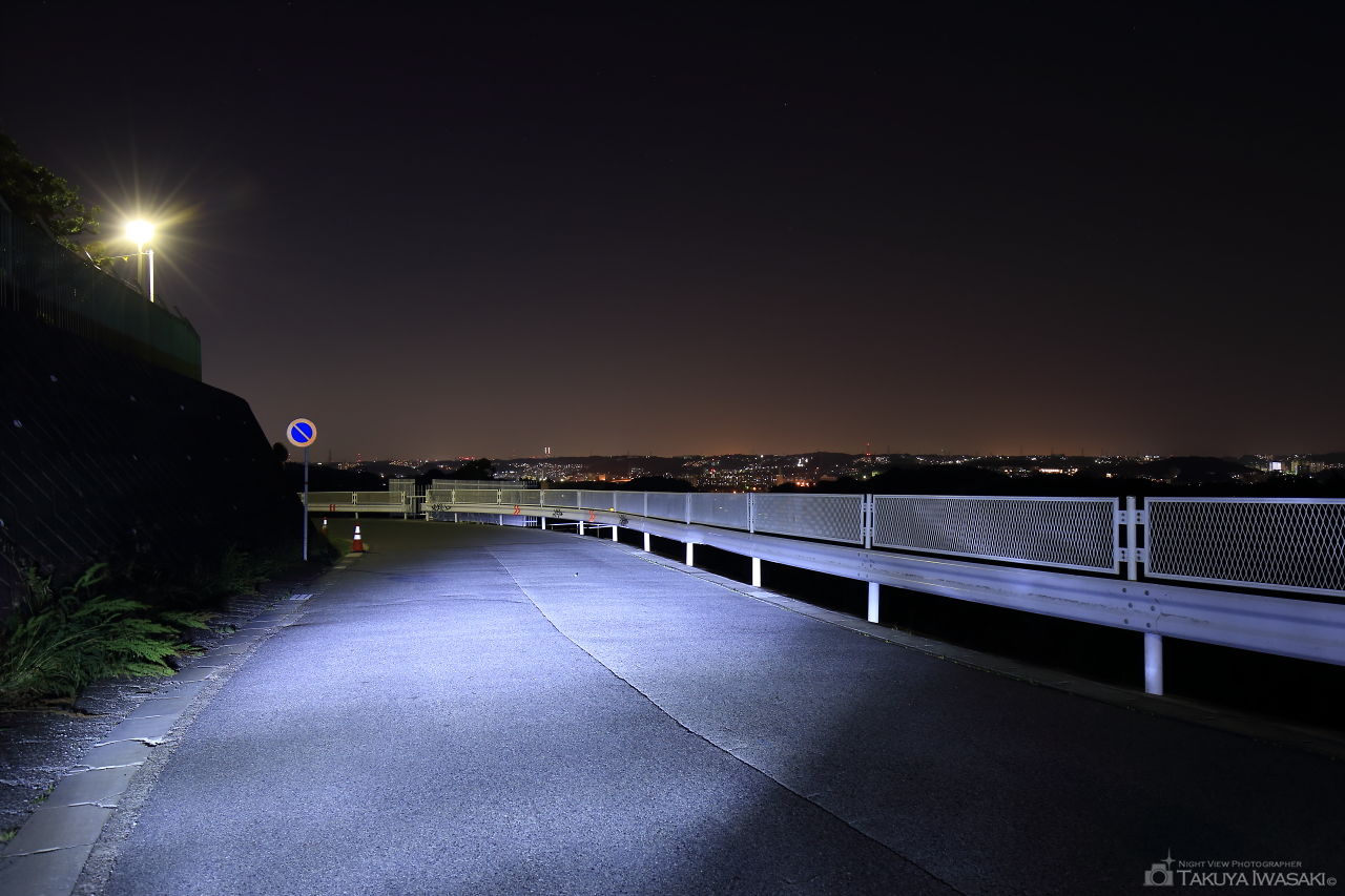 一段高い場所にある道路がビューポイント。展望施設などはなく、光量は控えめですが金井町や本郷台を中心とした夜景が広範囲に見渡せます。