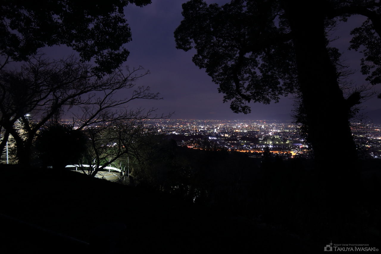 駐車スペースから徒歩5分程度の場所に展望所があり、太宰府市・筑紫野市方面を中心とした夜景が見渡せます。途中の歩道からも夜景が見渡せます。