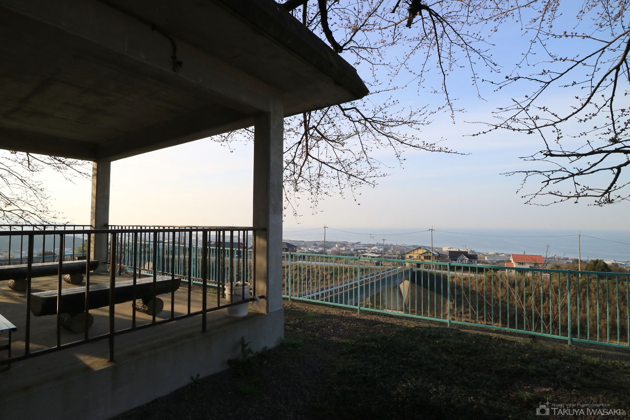 豊岡団地の付近にある小さな公園。地元住民のお花見スポットとして親しまれている公園ですが、高台にあるため見晴らしが良く、製紙工場を中心に四国中央市の夜景を観賞できます。公園には東屋があり、ベンチに座って夜景を楽しめますが、公園横の停車スペースに車を停めて車内から夜景を楽しめます。夜間に公園を訪れる人はほとんどいないため、運が良ければ貸切状態でゆったりと夜景を楽しめそうです。