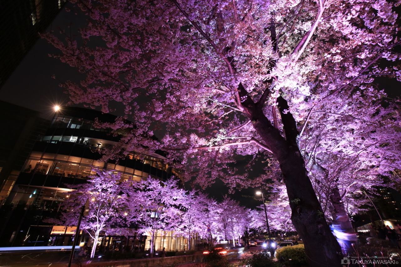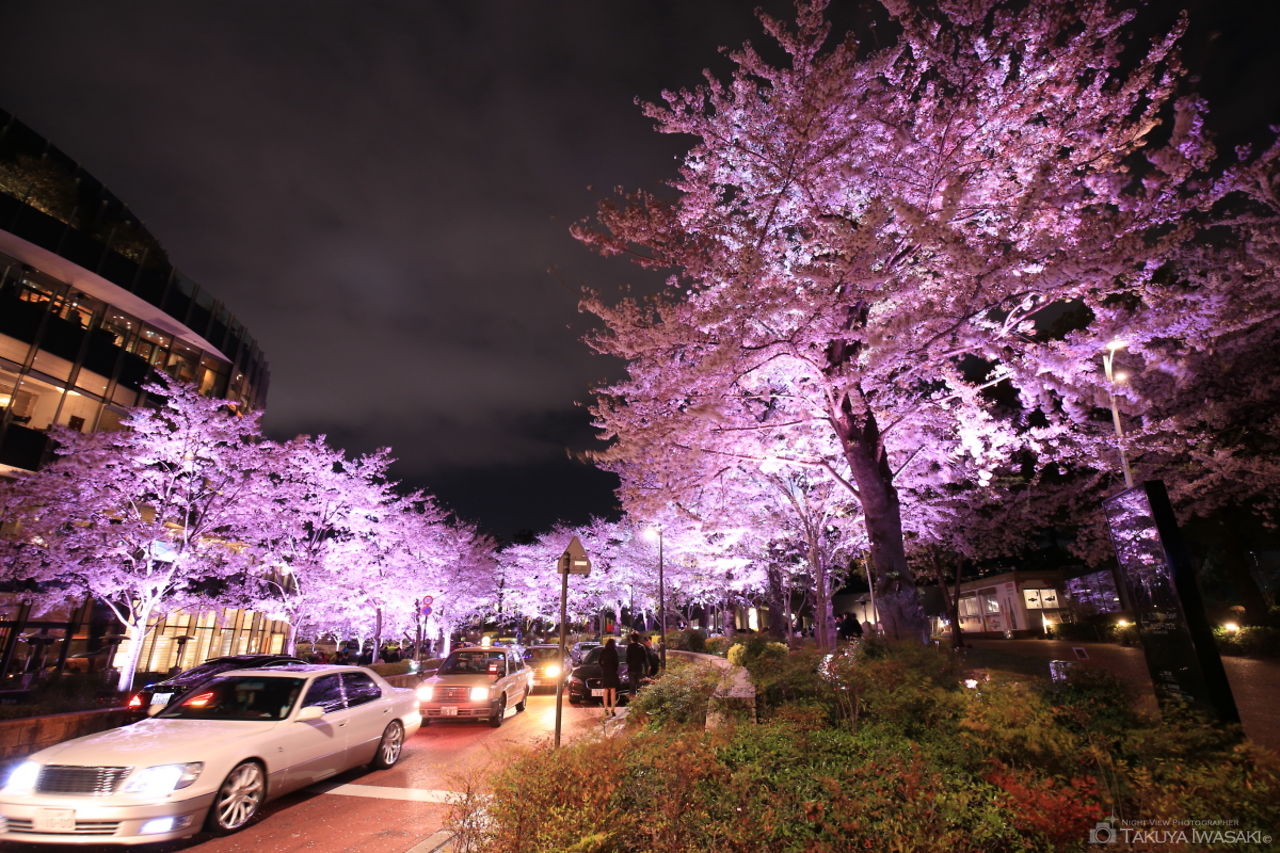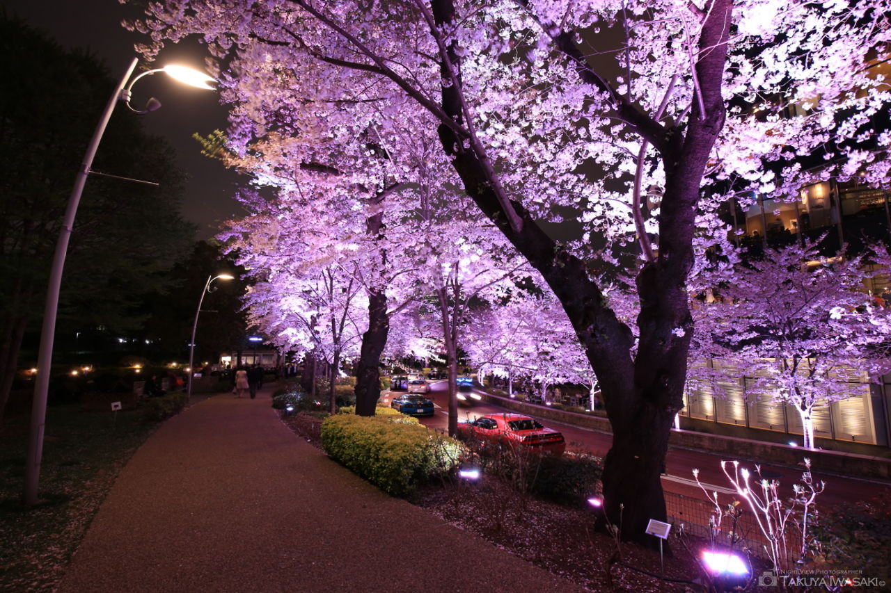 夜桜やイルミネーションの名所である東京ミッドタウン。約150本もの桜の木が並び、桜のトンネルをくぐりながら、夜桜を楽しめます。