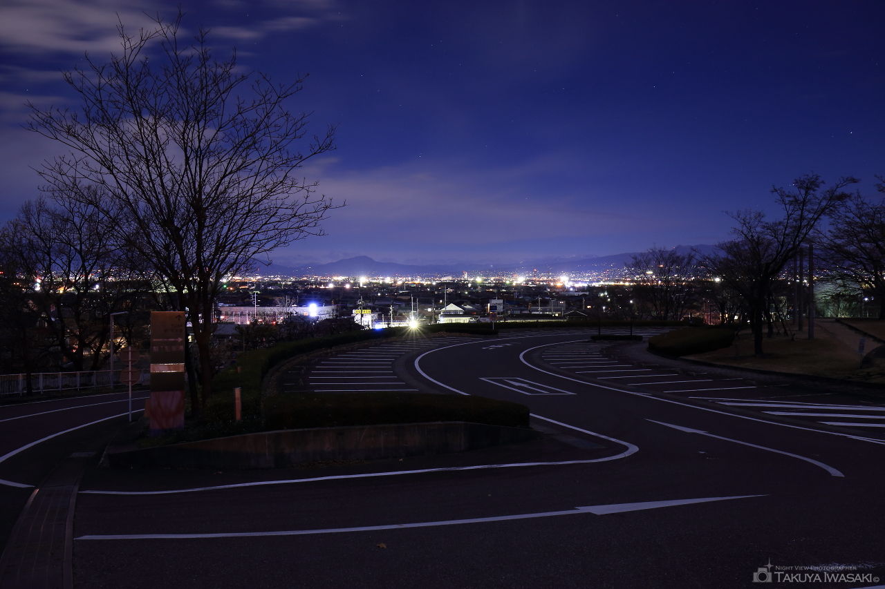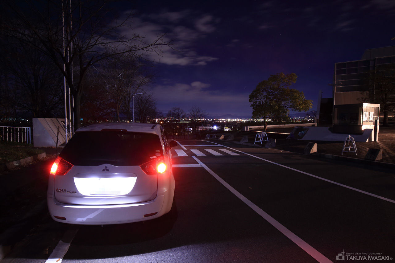 観音山聖地霊園に向かう途中の坂道と駐車スペースがビューポイント。フロントガラス越しに高崎市内の夜景がワイドに広がります。