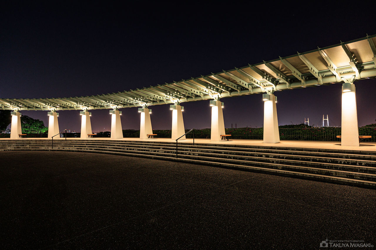 港の見える丘公園は山下公園と並ぶ観光地であり、高台に位置することから見晴らしは抜群です。みなとみらい方面を見渡せないものの、みなとみらいエリアに比べてベイブリッジが近いのが特徴です。公園内の展望台は広大な広場になっていて、ベンチなどの設備も整っていることから週末には多くのカップルや観光客が訪れて混雑します。ちなみにベイブリッジは日没後の24時まで毎時20分・50分に10分間だけ青色にライトアップされます。日没後の青みが残った空と青くライトアップされたベイブリッジが最も美しいタイミングでお勧めです。