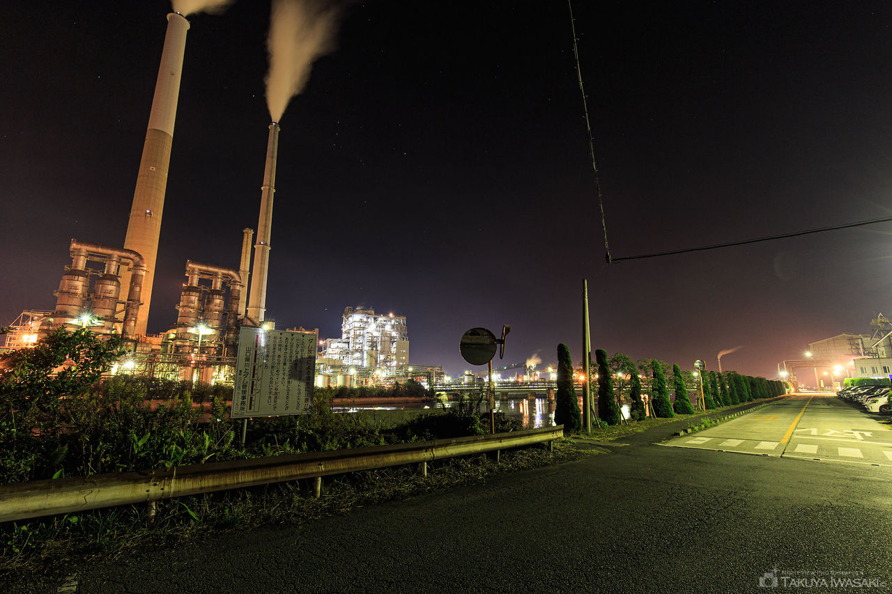 周南市の工場夜景スポットの中でも定番のビューポイント。車を走らせると左手に化学工場の大きな煙突が視界に入り、工場の私有地手前まで近づくとその迫力に圧巻させられます。道路からは草木が視界を遮ってしまいますが、部分的に視界の開けたポイントがあり、右手の歩道からも工場を眺められます。徳山駅や新南陽駅からも近いので、夜景ドライブのコースに入れても良さそうです。