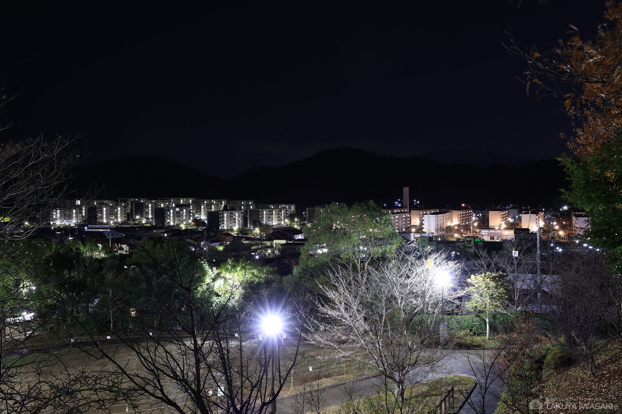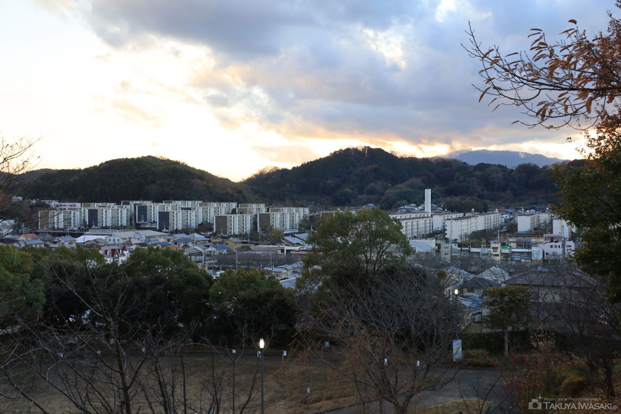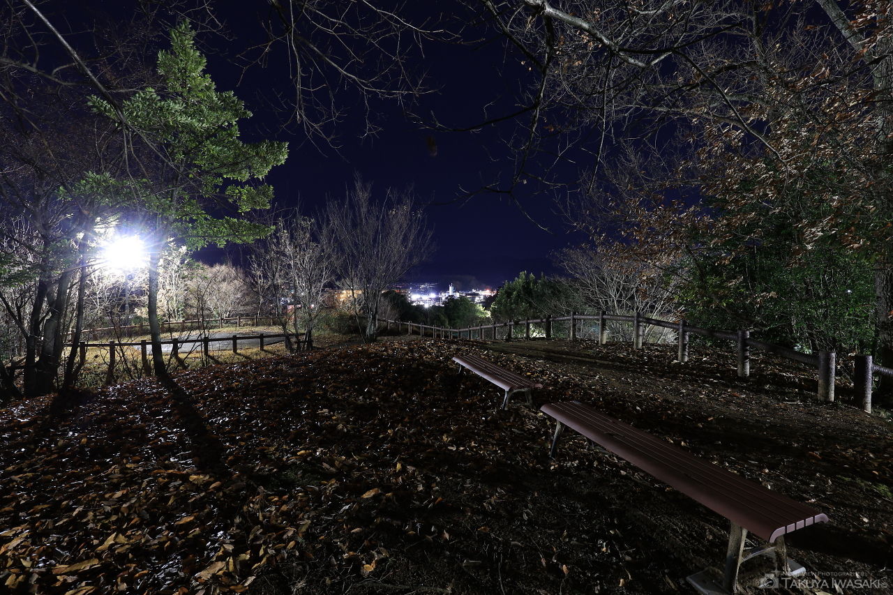 標高148mの緩やかな丘からは、橿原市内を中心とした夜景を広範囲に見渡せます。暗い道を歩きますが、労力に見合う夜景が楽しめます。