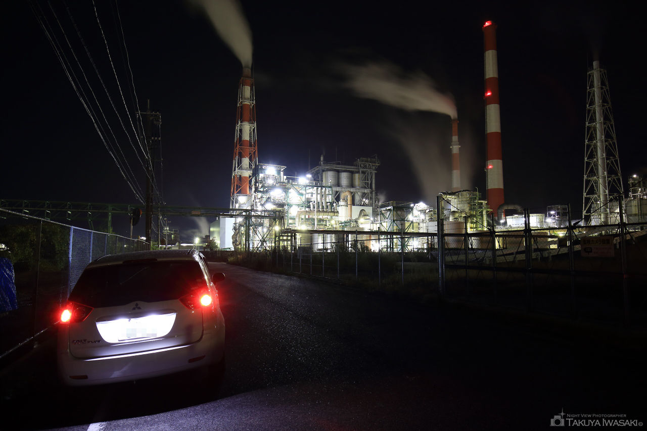 化学工場を間近で眺められるビューポイント。巨大な煙突と光輝くプラントの美しさに圧倒されること間違いなし。