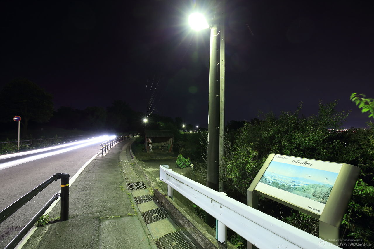 夜景が見えるのはA地区とC地区になっており、案内版を見る限りはC地区の14号墳のみがビューポイントのように見えますが、A地区に隣接する道路の歩道部分も眺望地点となっており、ここから三島・沼津方面の夜景を楽しめます。