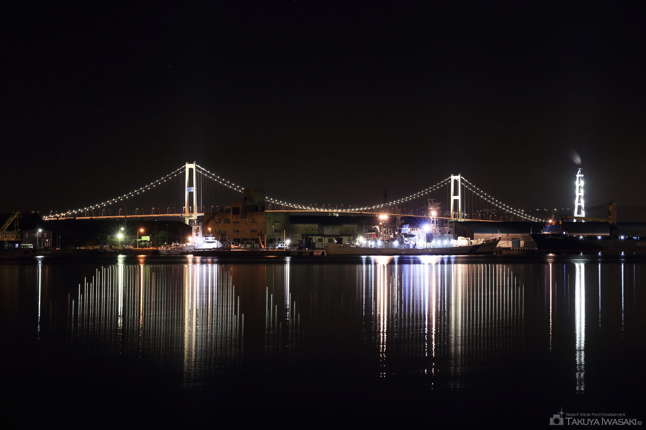 駐車場や自動販売機が整備された埠頭の先がビューポイント。白鳥大橋のライトアップや新日鐵住金の工場が見渡せます。