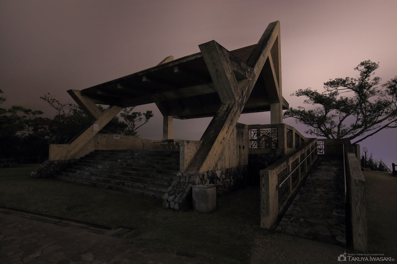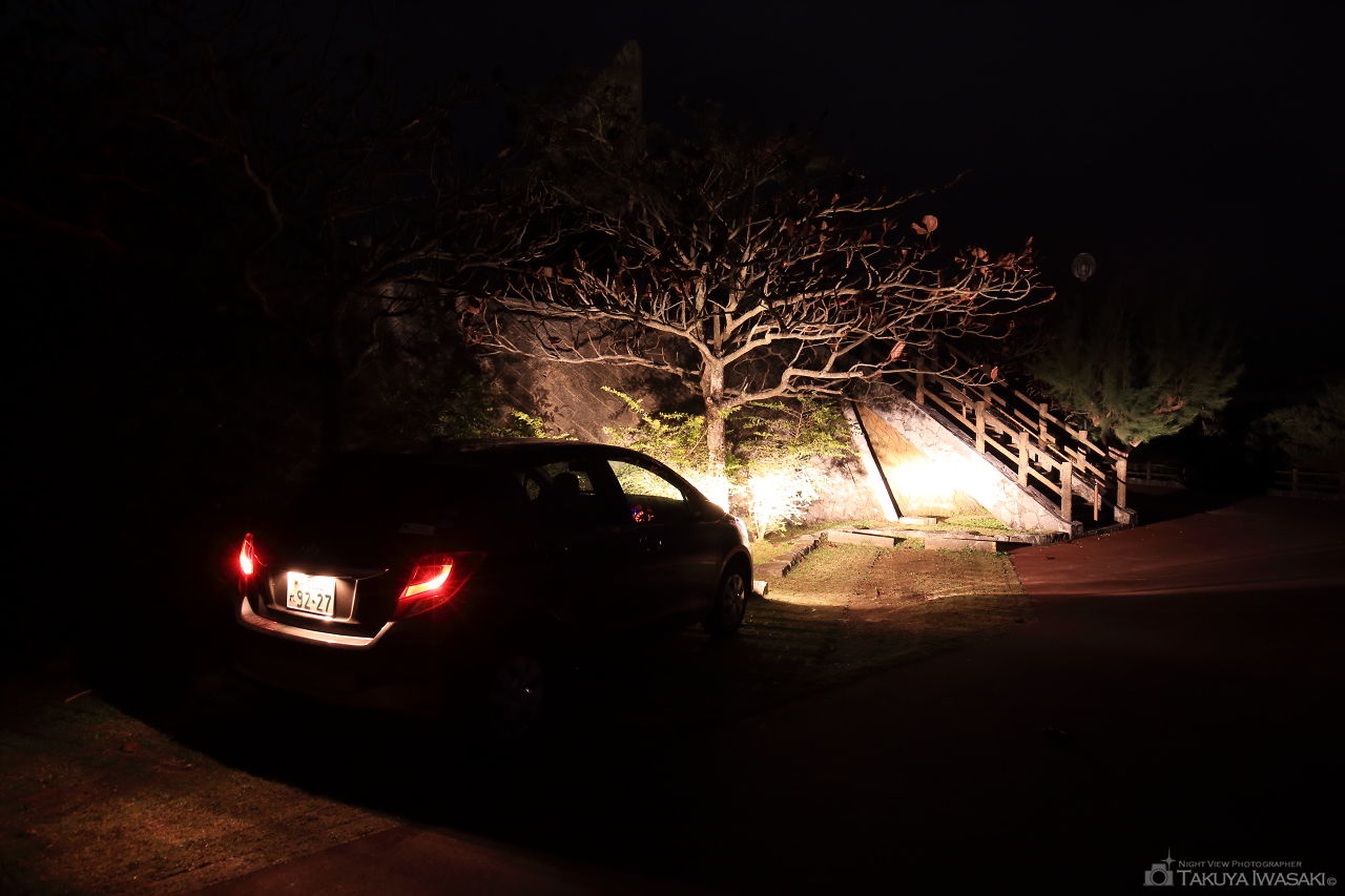 南展望台からも名護市街地を一望できますが、木々の生長のために年々視界が狭くなってきているようで、訪問時もわずかな明かりしか見えませんでした。展望台の一帯は広場になっているので、日中に広場でゆったりして、天上展望台などから夜景を楽しむコースも良さそうです。