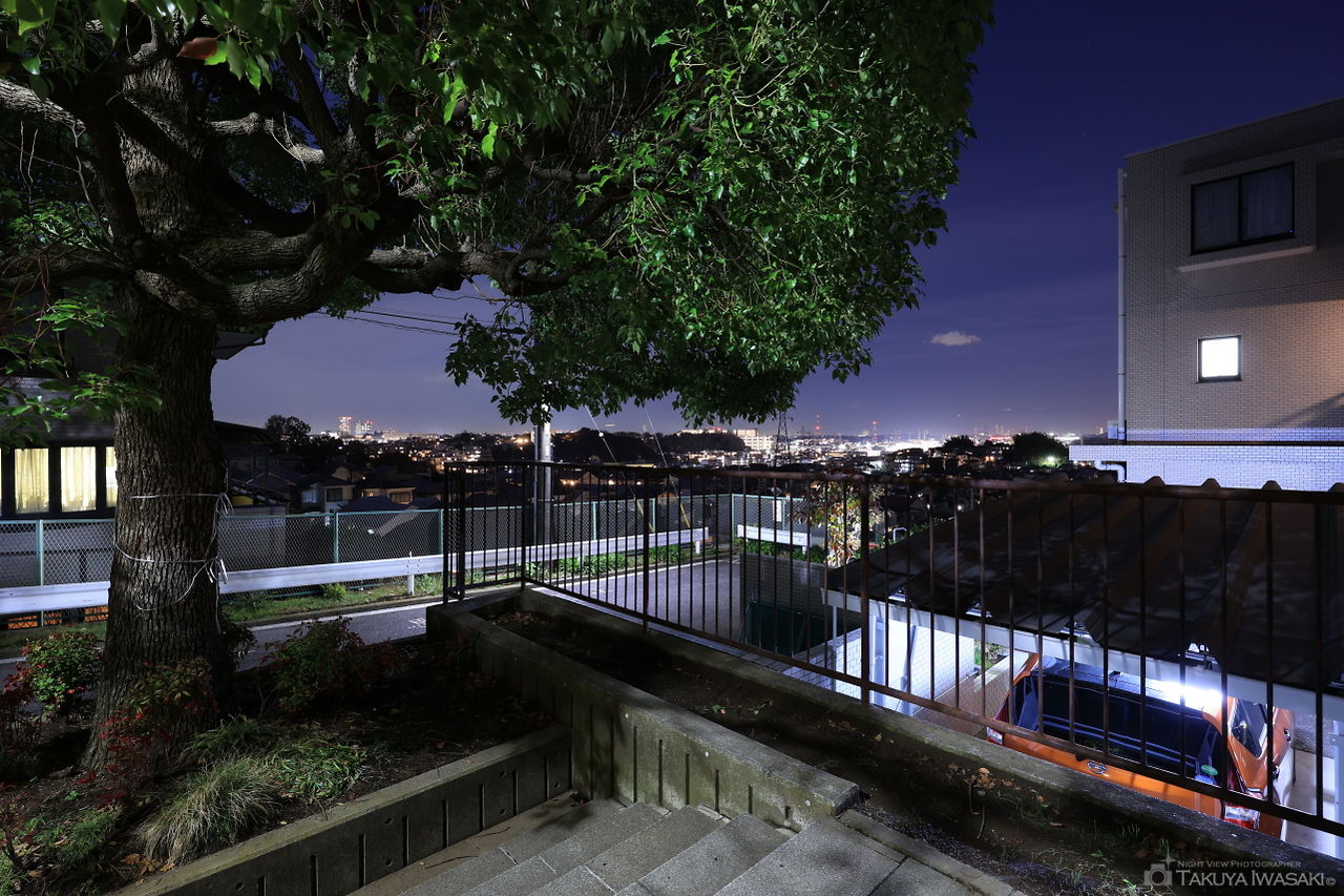 公園横の階段付近がビューポイント。日吉本町駅方面の夜景が見渡せます。天気が良ければ遠くに横浜ベイブリッジが見渡せます。