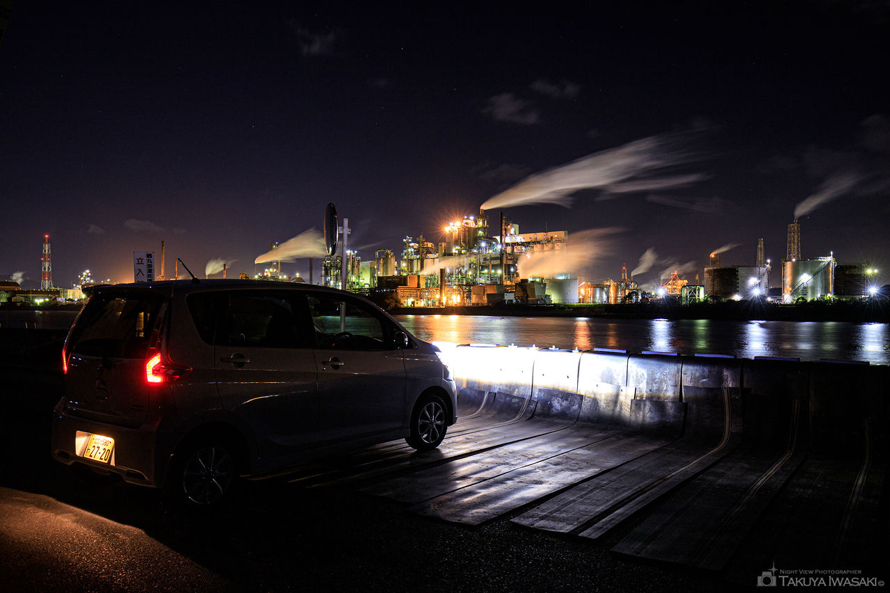 対岸の化学工場を見渡せる穴場スポット。埠頭の先に車を停車させて、車内からも工場夜景が楽しめます。