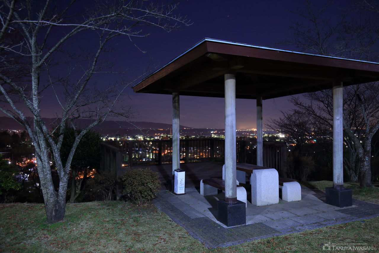 桜の名所としても知られている広大な公園。駐車場から西方向に歩くと3階建ての展望台があり、屋上から夜景が楽しめます。
