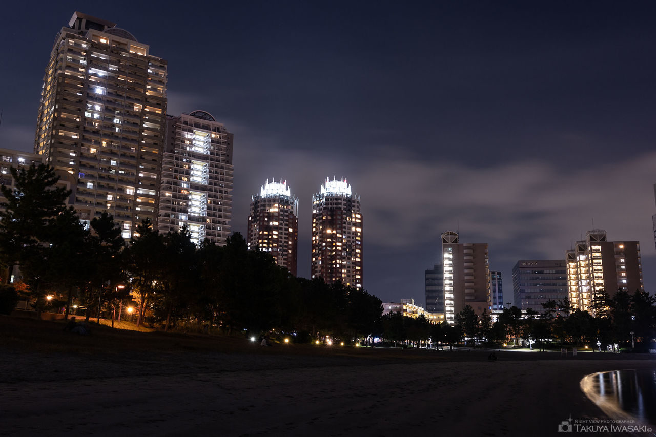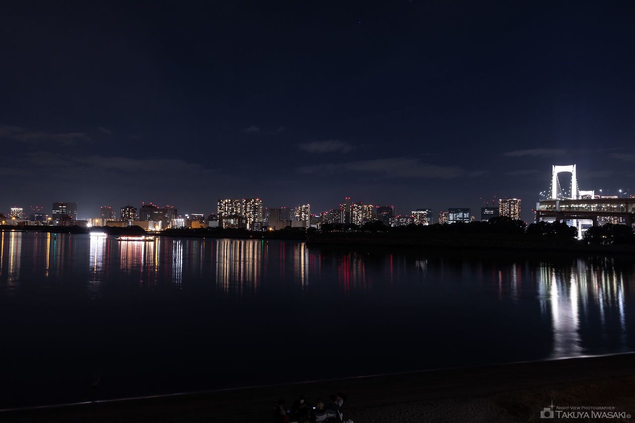 おだいばビーチはお台場海浜公園内にある延長約800mの砂浜で夜になると周囲が暗いためか、訪れる人はほとんどいなくなります。砂浜からフジテレビのあるお台場方向と反対側のレインボーブリッジまで幅広く夜景を見渡せます。特に水面に反射したお台場側の明かりが美しく、静かに夜景を眺めるのにお勧めです。
